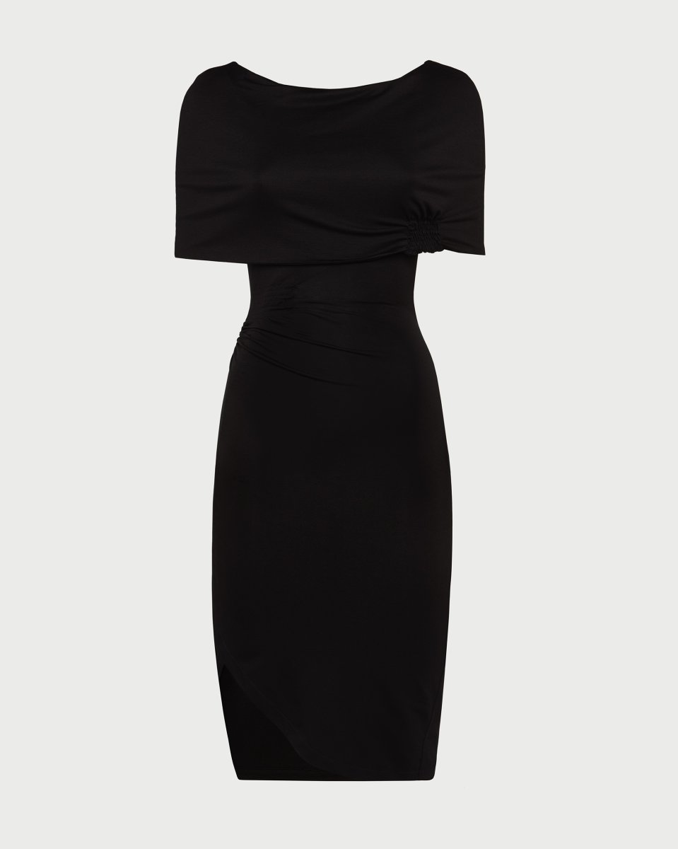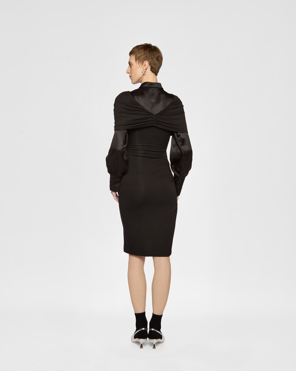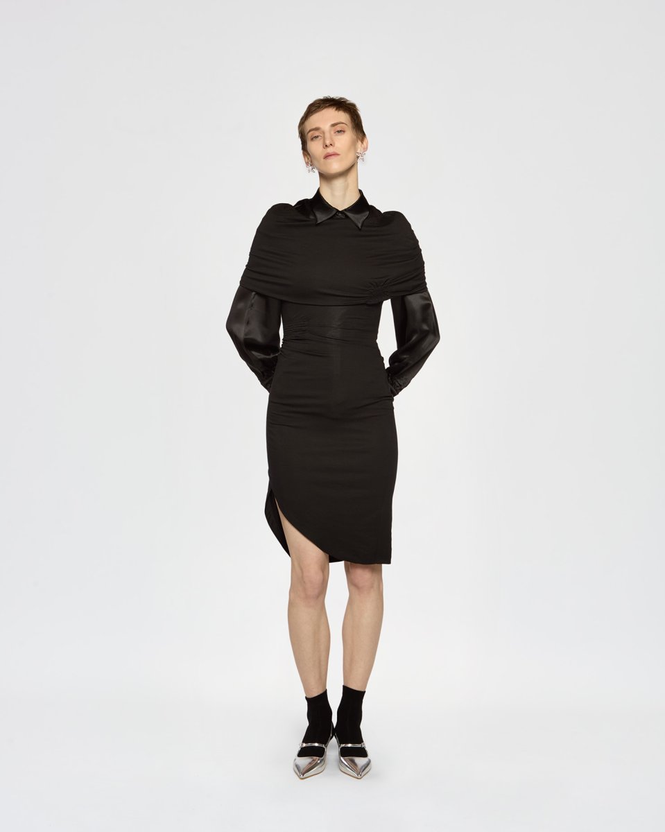Nero Abito Celine con arricciature frontali, spacco e mantella coprispalle. Made in Italy.