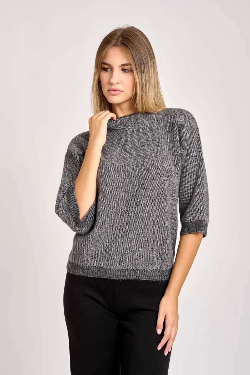 La maglia presenta un collo leggermente a cratere, maniche scese polsino a costine e leggermente largo. Ha una leggera brillantezza con effetto lurex visibile nel tessuto. La trama rasata a coste sottili verticali. La modella รจ alta 1,78cm e indossa una taglia 42