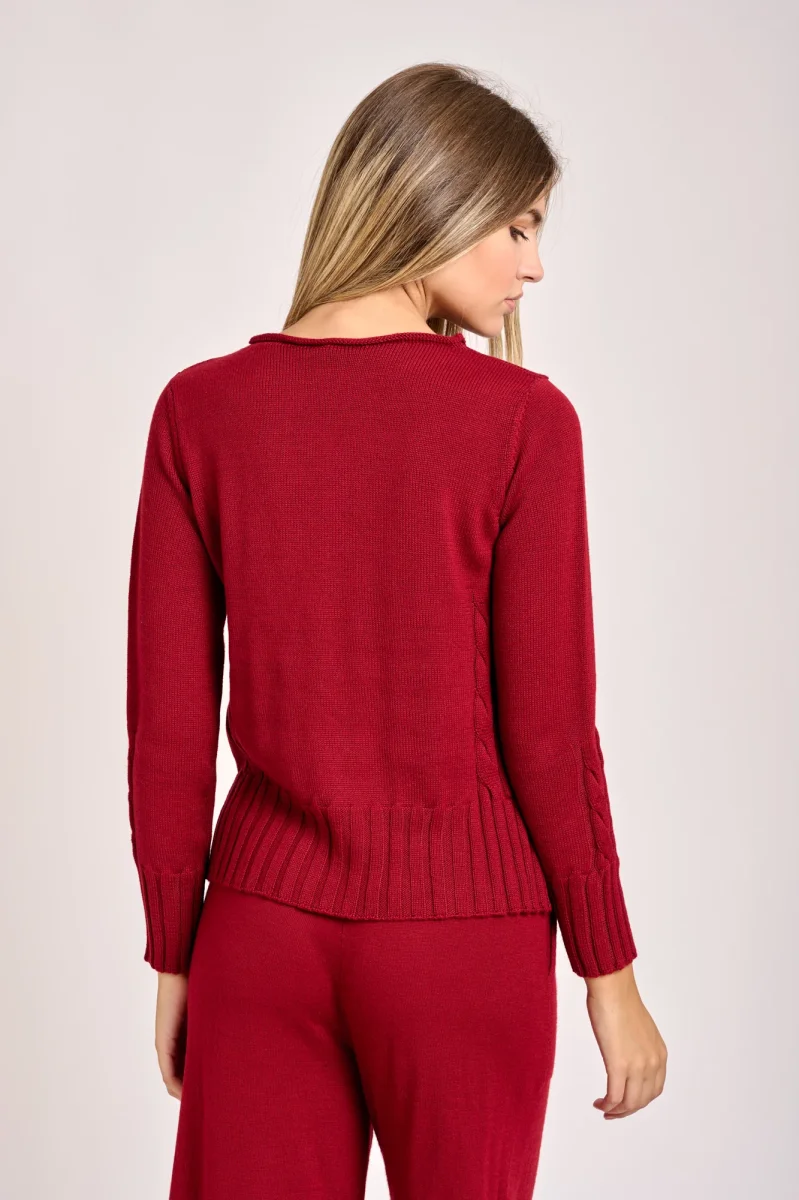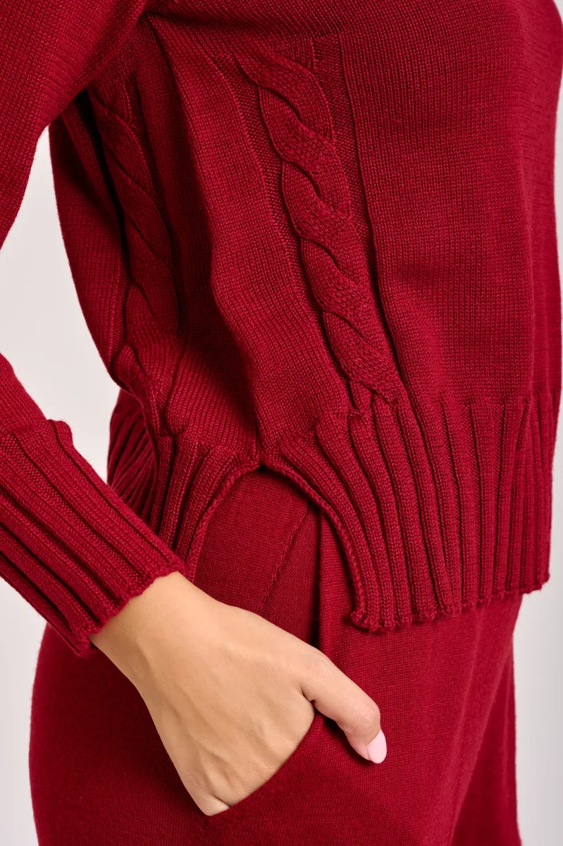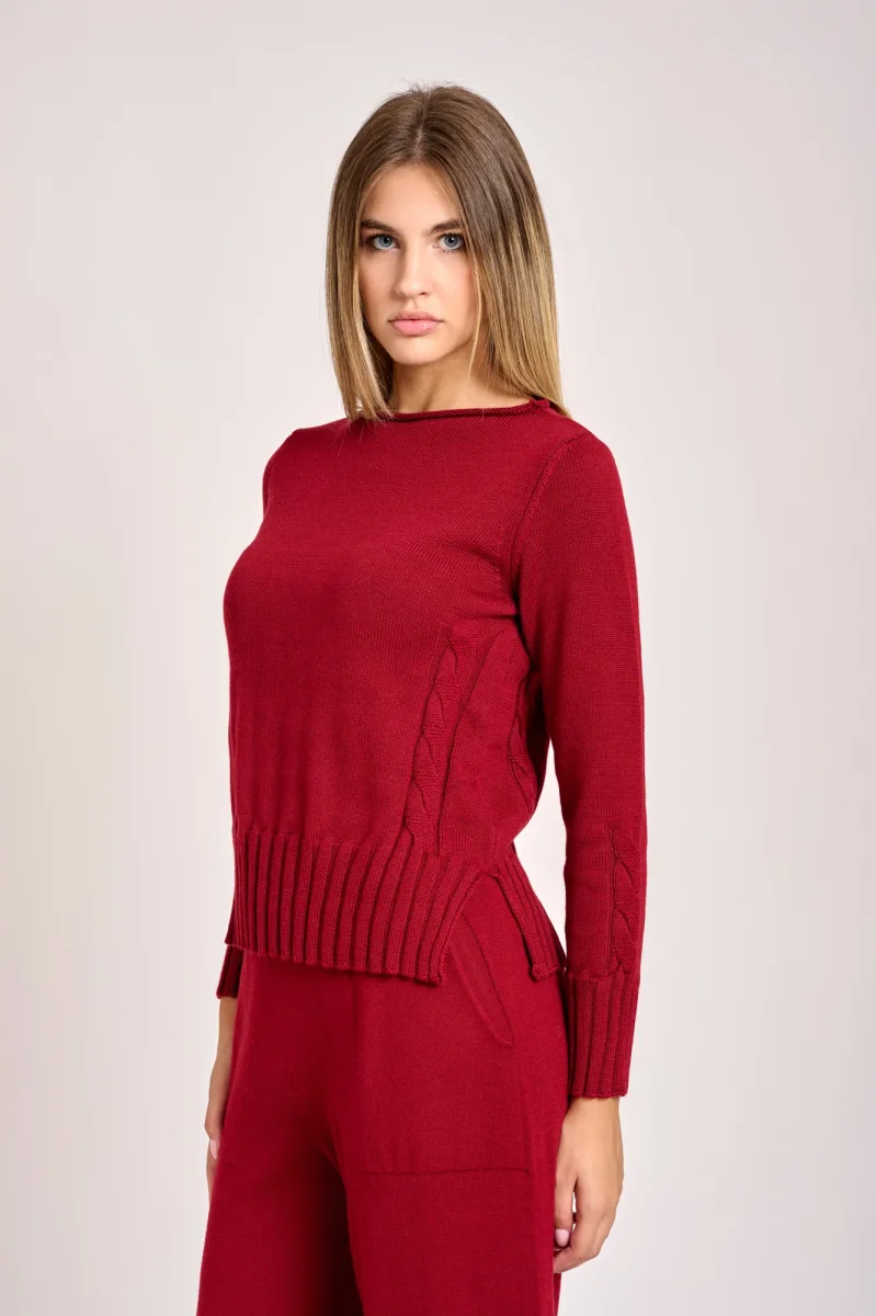 Il corpo presenta un design a maglia lavorata con un motivo a treccia o a rilievo visibile lungo le maniche e sui fianchi che aggiunge un elemento decorativo. Ha uno scollo a barchetta polsini e i fianchi a coste, vestibilità regolare con spacchi lungo i fianchi maglia adatta per un look casual o semi formale. La modella è alta 1,78cm e indossa una taglia 42