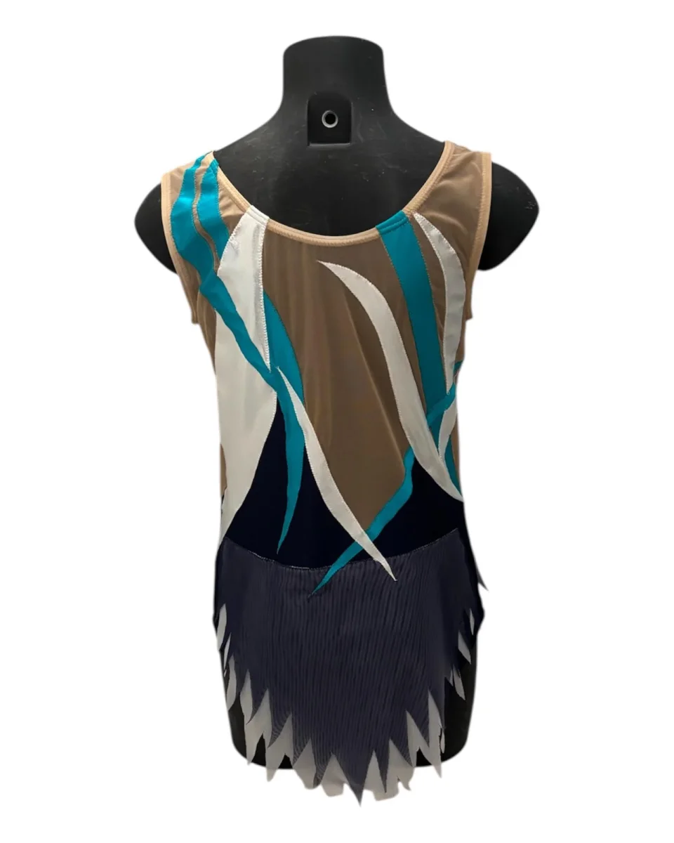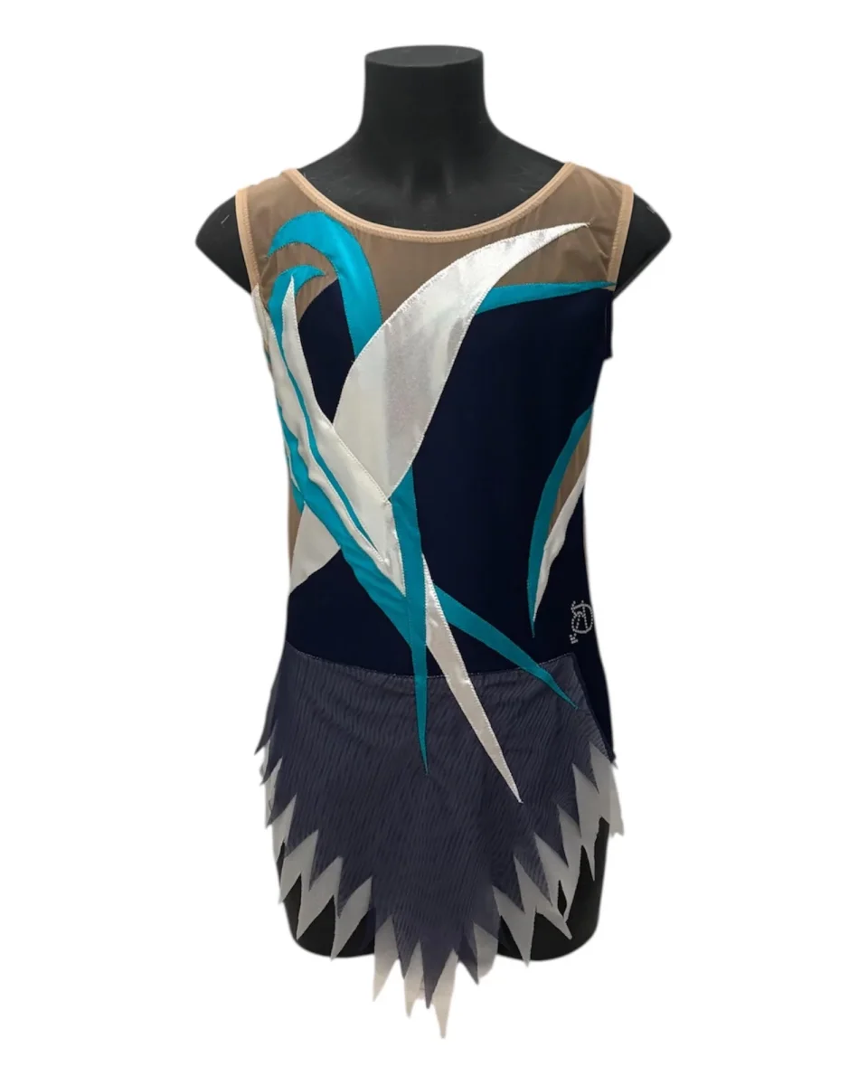 Body da ginnastica artistica e ritmica in stile marino, con base nude e blu navy. Decorato con applicazioni in lycra lucida e tessuto metallizzato nei toni del turchese, bianco e argento. La gonna a punte in tulle aggiunge leggerezza e movimento. Elegante, dinamico e scenografico. Realizzato artigianalmente in Italia. * IL CAPO IN FOTO E’ […]