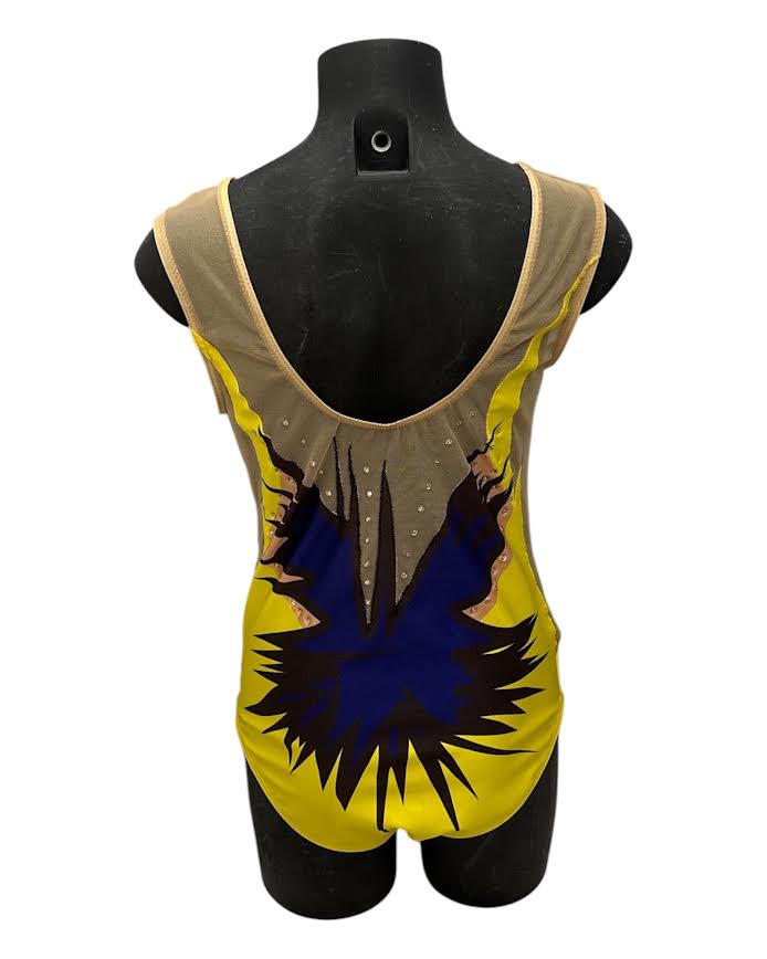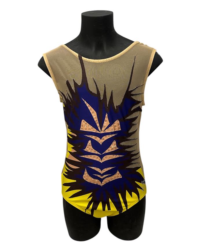 La grafica esplosiva, fondi nude con inserti a “raggi” in blu, nero e lime, trasmette vigore e presenza scenica, valorizzata da strass applicati a mano.