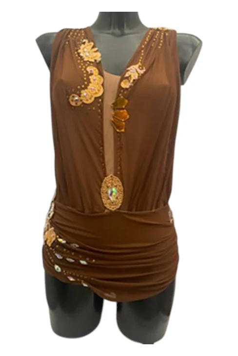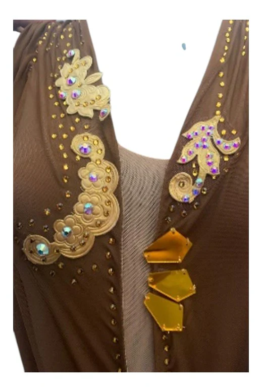 Questo body in rete elasticizzata marrone si distingue per l’eleganza dei dettagli: applicazioni color oro arricchiscono la superficie, impreziosite da strass di diverse dimensioni e tonalità , inclusi pietre cucite a mano che ne esaltano la raffinatezza.
