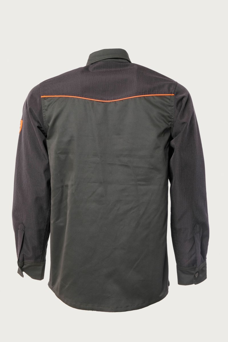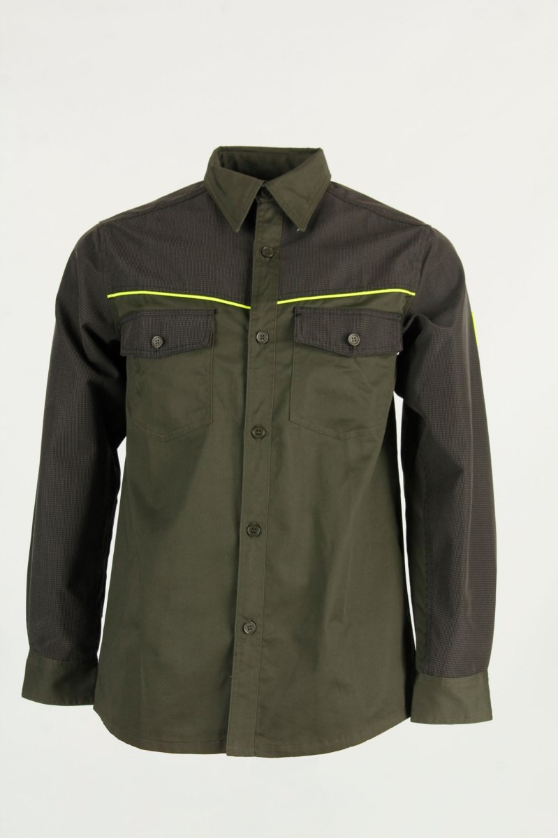 Camicia alta visibilità con rinforzi in tessuto tecnico impermeabile e anti spino. Due comode tasche con bottone. Disponibile nelle varianti total green o giallo alta visibilità.