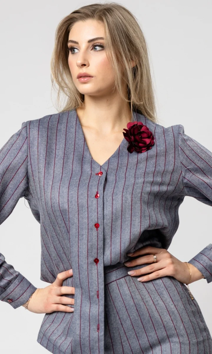 La camicia presenta una fantasia a righe verticali nelle tonalitร del grigio e del bordeaux, studiate per creare armonia e conferire un effetto ottico snellente. La costruzione sartoriale, i bottoni ricercati e la linea leggermente morbida la rendono un capo femminile, versatile e capace di impreziosire qualsiasi outfit.