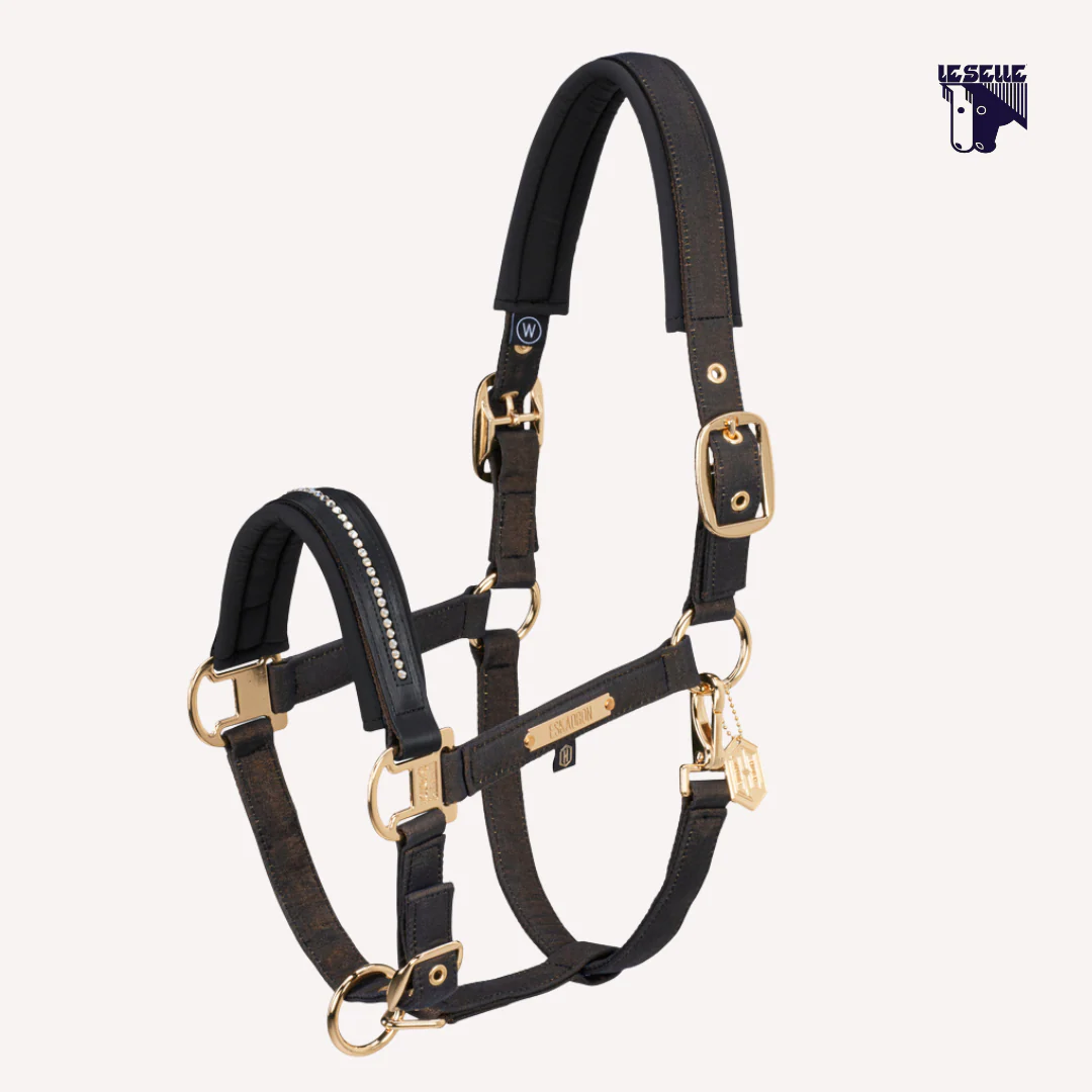 Cavezza Eskadron Tessuto glamour lurex Imbottitura di capezzina e sovracapo in softshell Rivestimento esterno della capezzina in ecopelle Inserto in cristalli Doppia regolazione Fibbie dorate