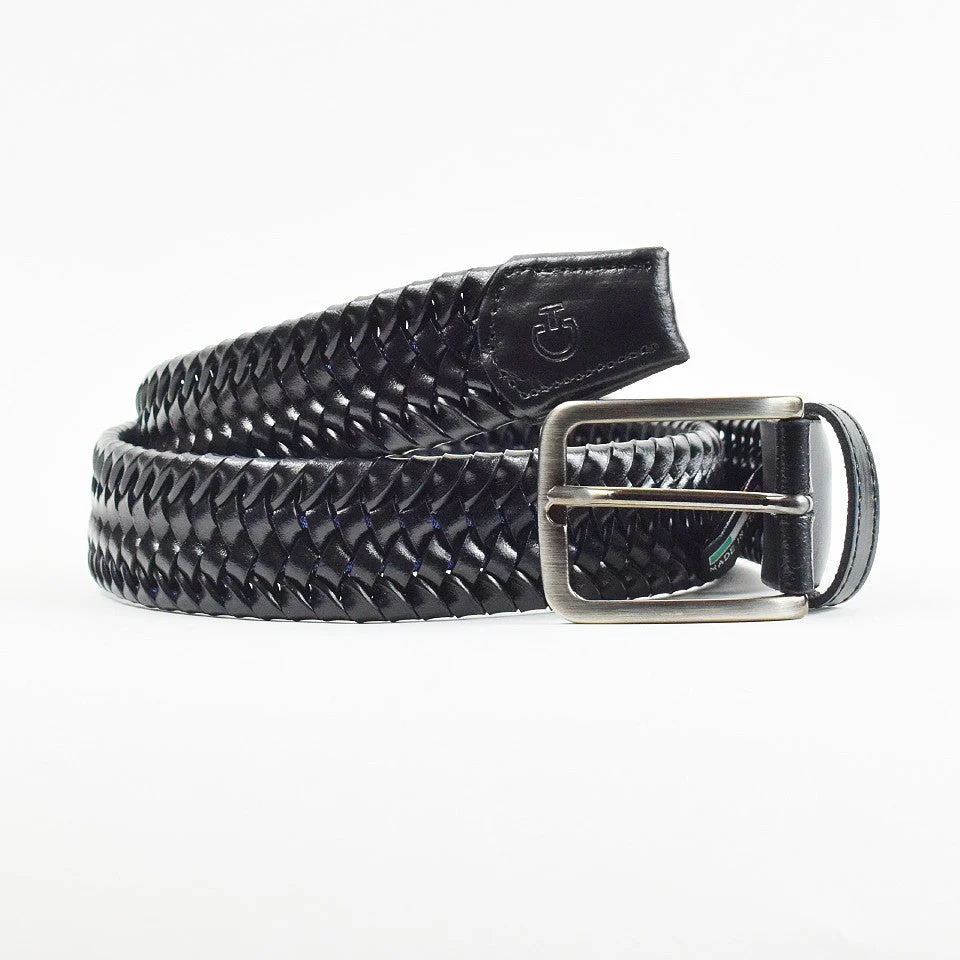 Cintura uomo Cavalleria Toscana modello Leather Stretch stripe Tessuto elasticizzato blu rivestito in pelle nera Finiture in pelle 100% made in Italy
