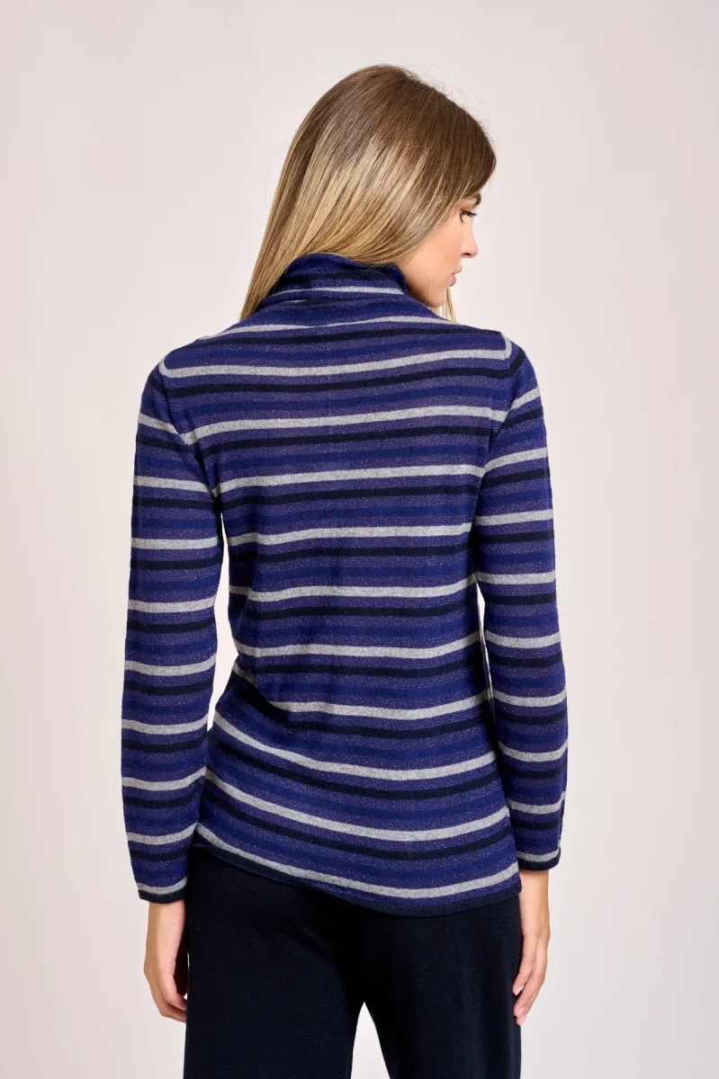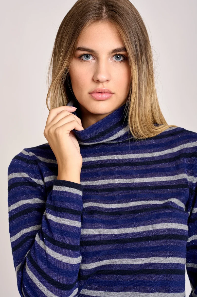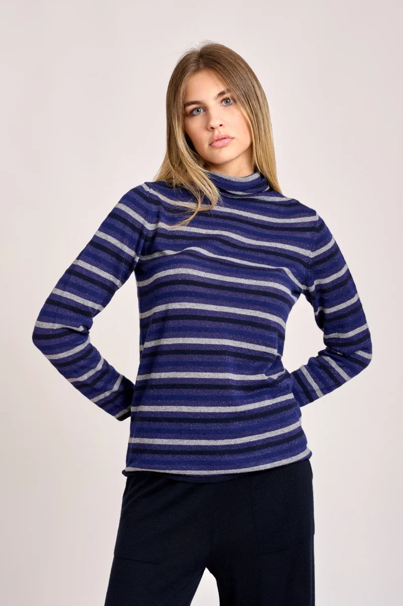 Maglia a collo alto a righe leggermente scintillante dovuta al filato metallico, manica larga buona vestibilitร .