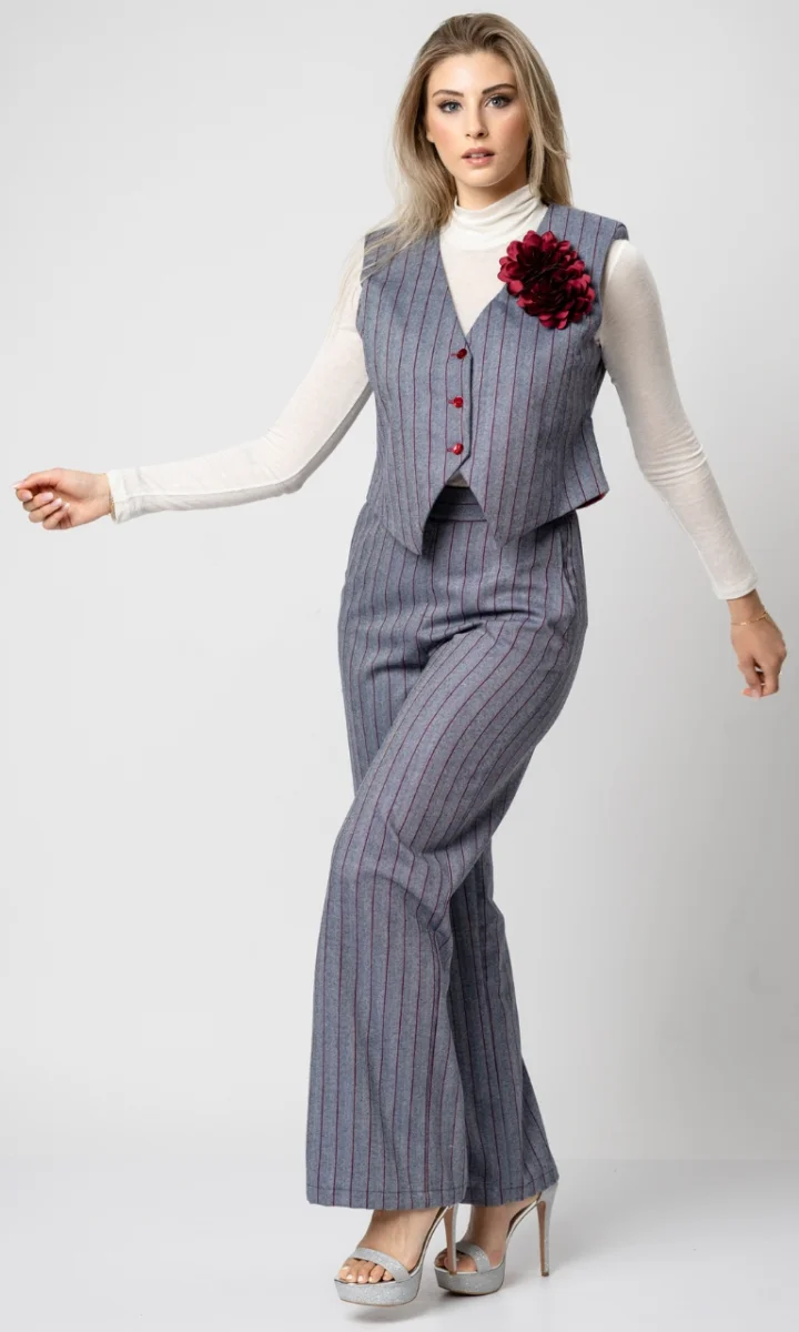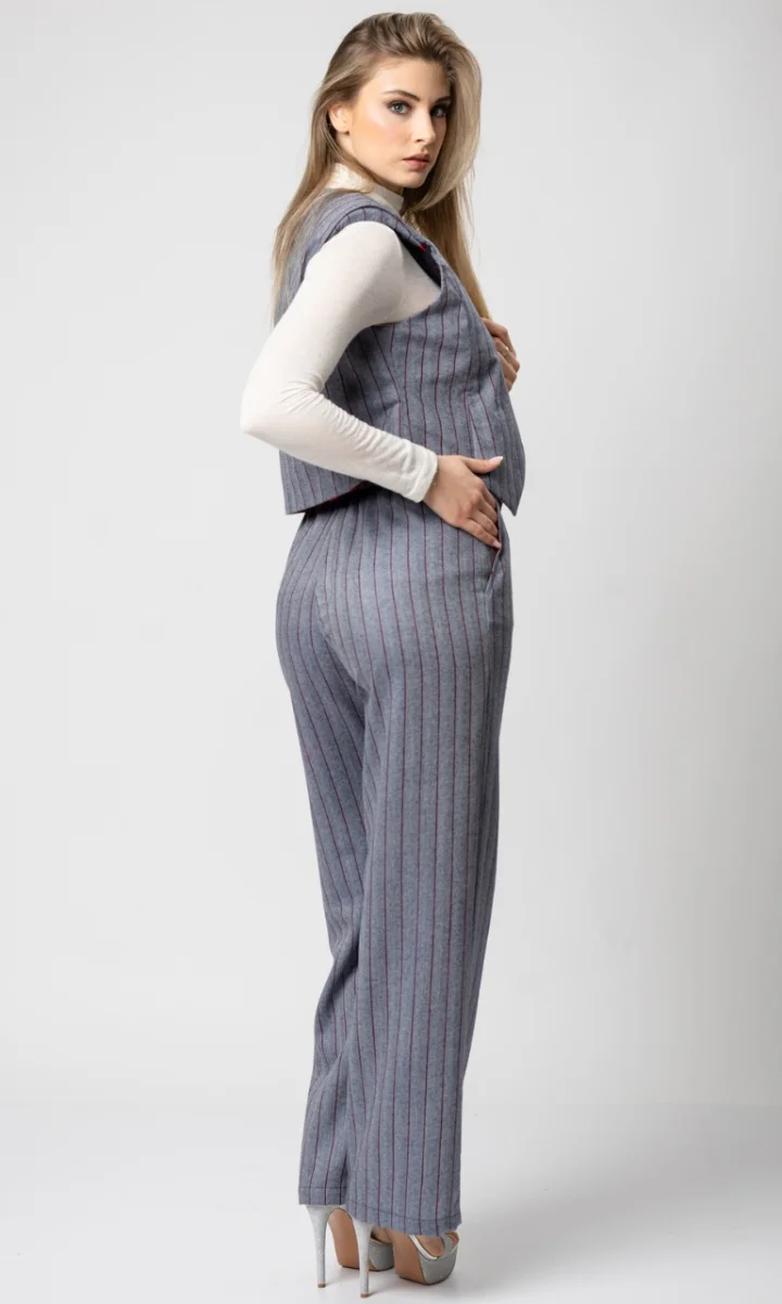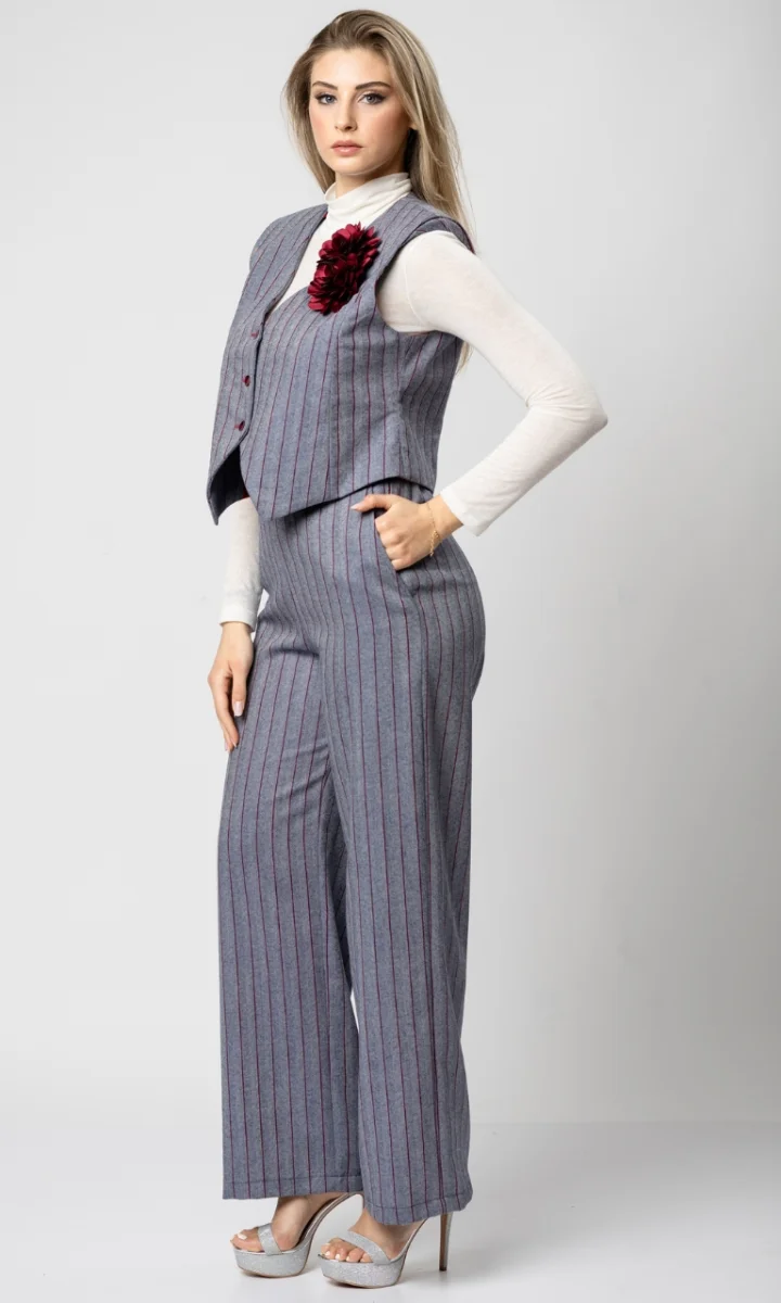 Completo donna elegante con pantalone palazzo e gilet a righe: stile moderno e sofisticato per l’inverno. Perfetto per distinguersi in ogni occasione formale grazie al design sartoriale e ai dettagli ricercati.