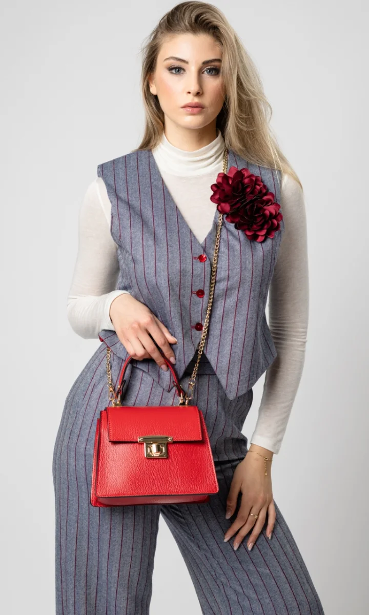 La vestibilitร  regolare dei pantaloni palazzo slancia la figura e si adatta a ogni silhouette, mentre il gilet donna invernale si presta a molteplici interpretazioni: indossalo sopra un dolcevita per un outfit professionale, oppure osa con una camicia bianca per un look contemporaneo. Le sottili righe verticali blu e bordeaux donano un tocco di originalitร  e ricercatezza, rendendo questo completo donna invernale un capo senza tempo. Sceglilo per i tuoi appuntamenti business, cerimonie o semplicemente per sentirti impeccabile ogni giorno.