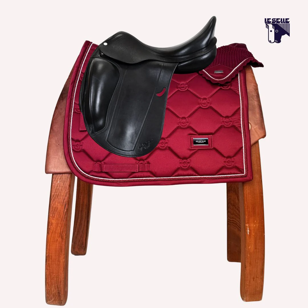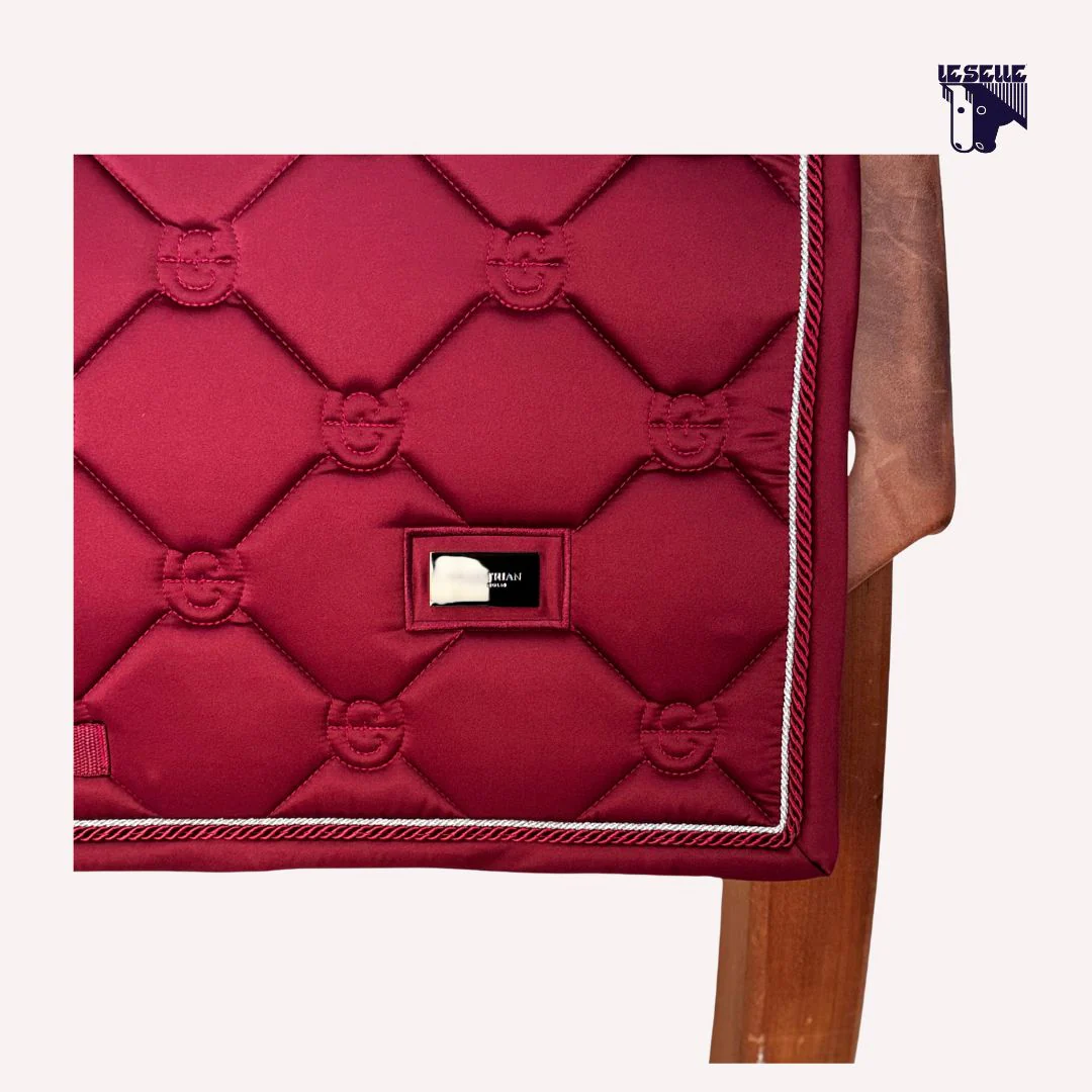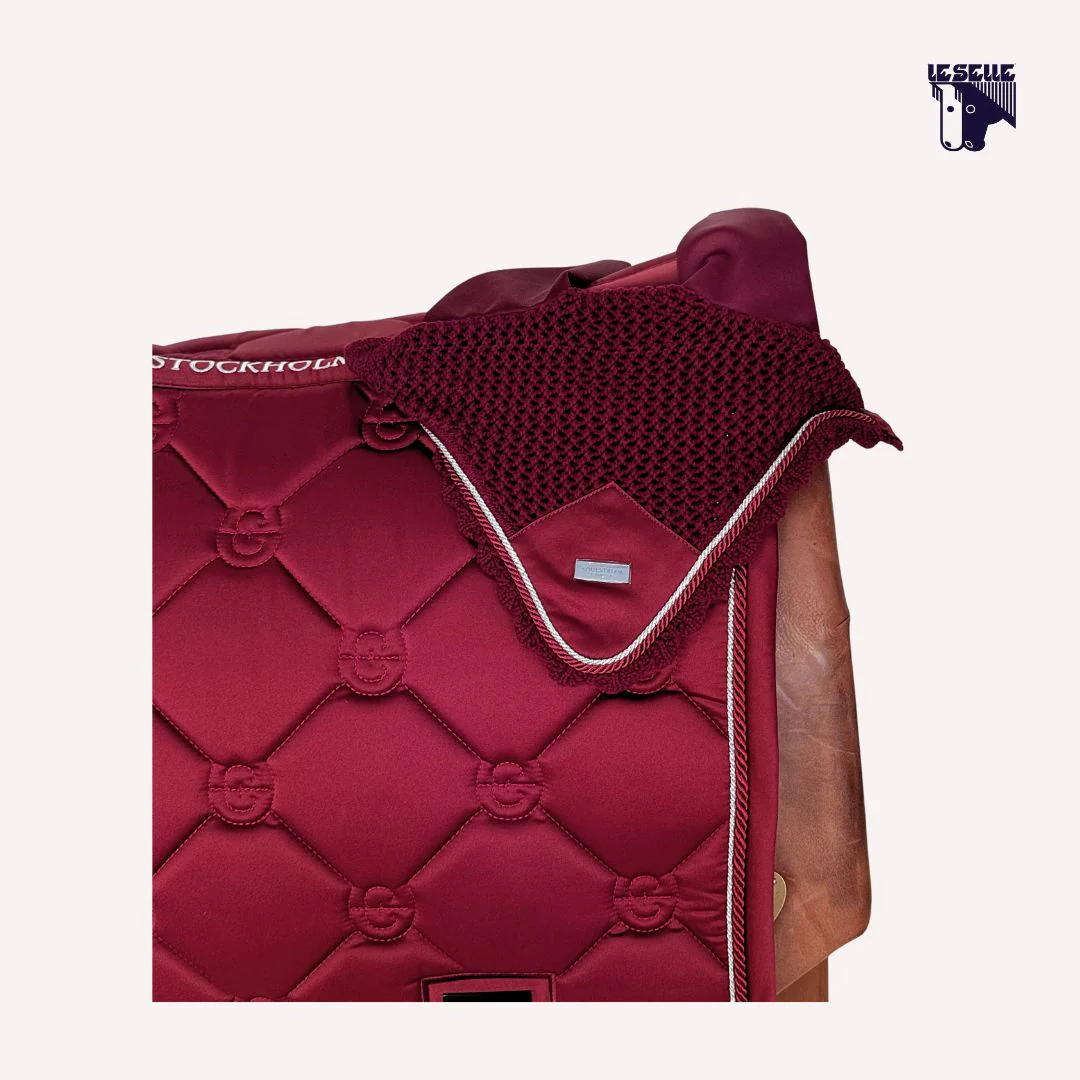 Sottosella da dressage e cuffietta Equestrian Stockholm Tessuto lucido tipo raso Trapuntatura con logo ES Interno in tessuto tecnico High IQ cool confort Traspirante Bordo tono su tono Cordino argento e blordeaux Cuffietta in coordinato