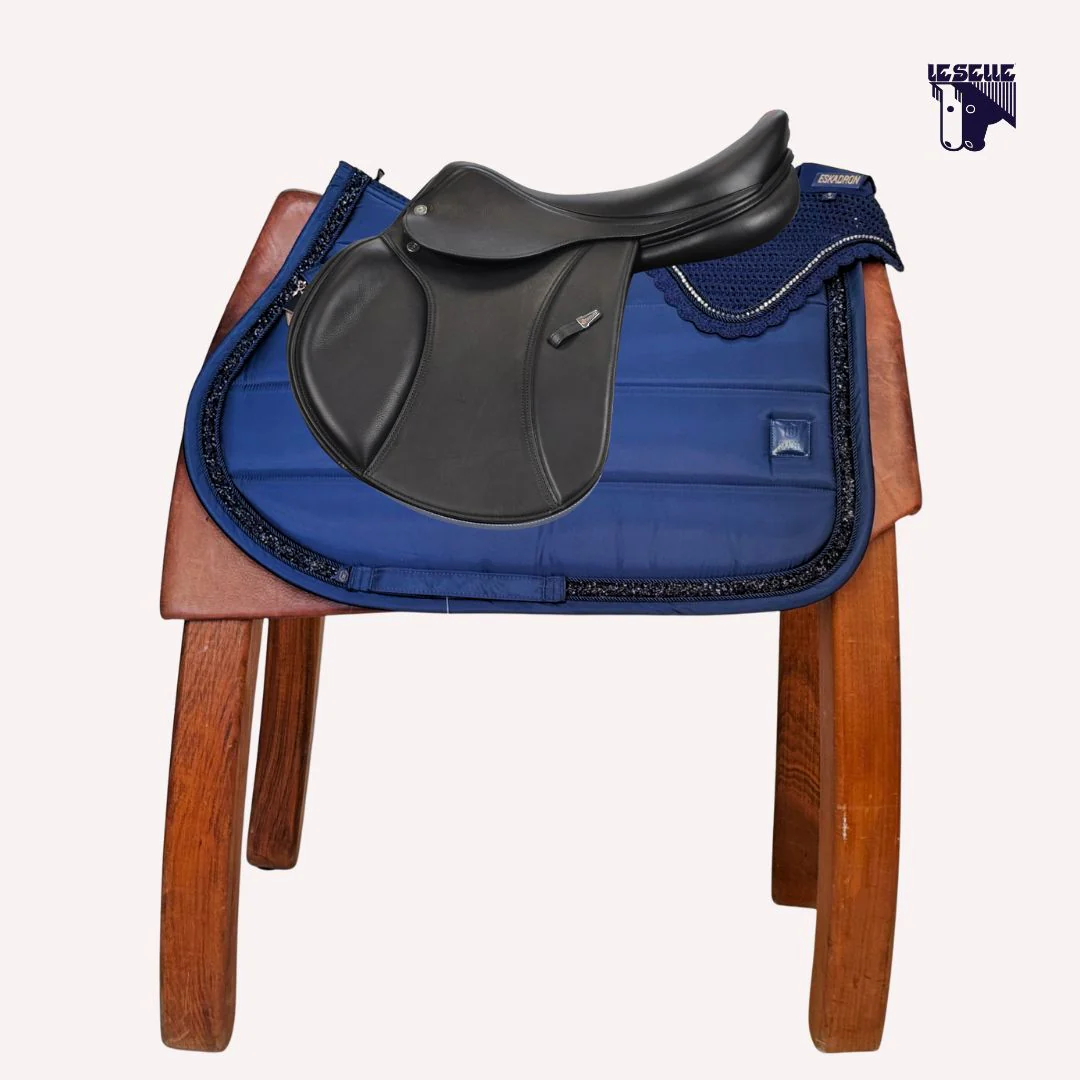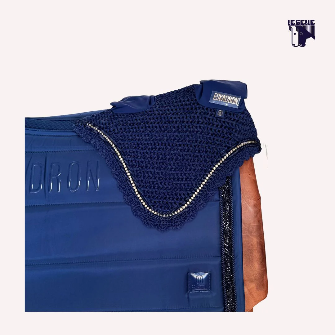 Sottosella da salto Eskadron e cuffietta Esterno in tessuto satinato Interno in tessuto tecnico Spina dorsale in mesh traspirante Grip sulla schiena con scritta Eskadron Bordo largo con cristalli Cuffietta in coordinato