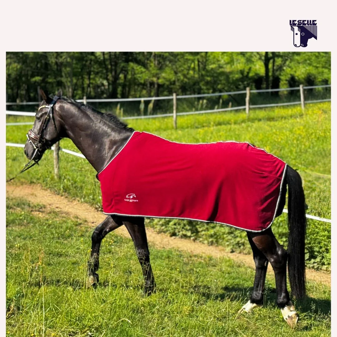 Coperta in pile Sarm Hippique Pile leggero Chiusura frontale con velcro Piccolo logo sulla spalla Bordo blu e bianco