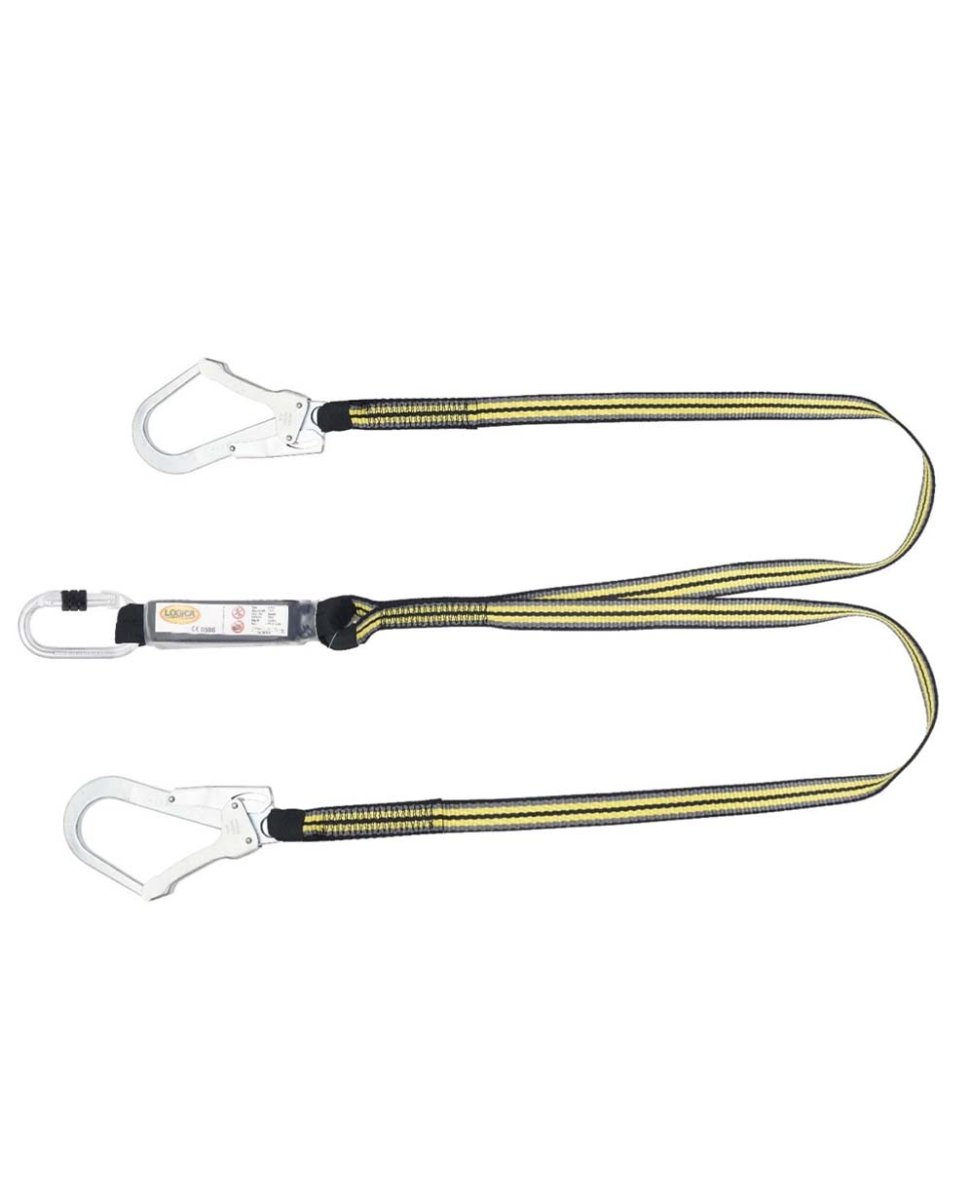 Cordino anticaduta a due punti di ancoraggio. Con assorbitore di energia. Lunghezza 1,8 metri. In un lato un moschettone a ghiera, sull’altro due connettori a grande apertura (55 mm) con chiusura di sicurezza a doppia leva.