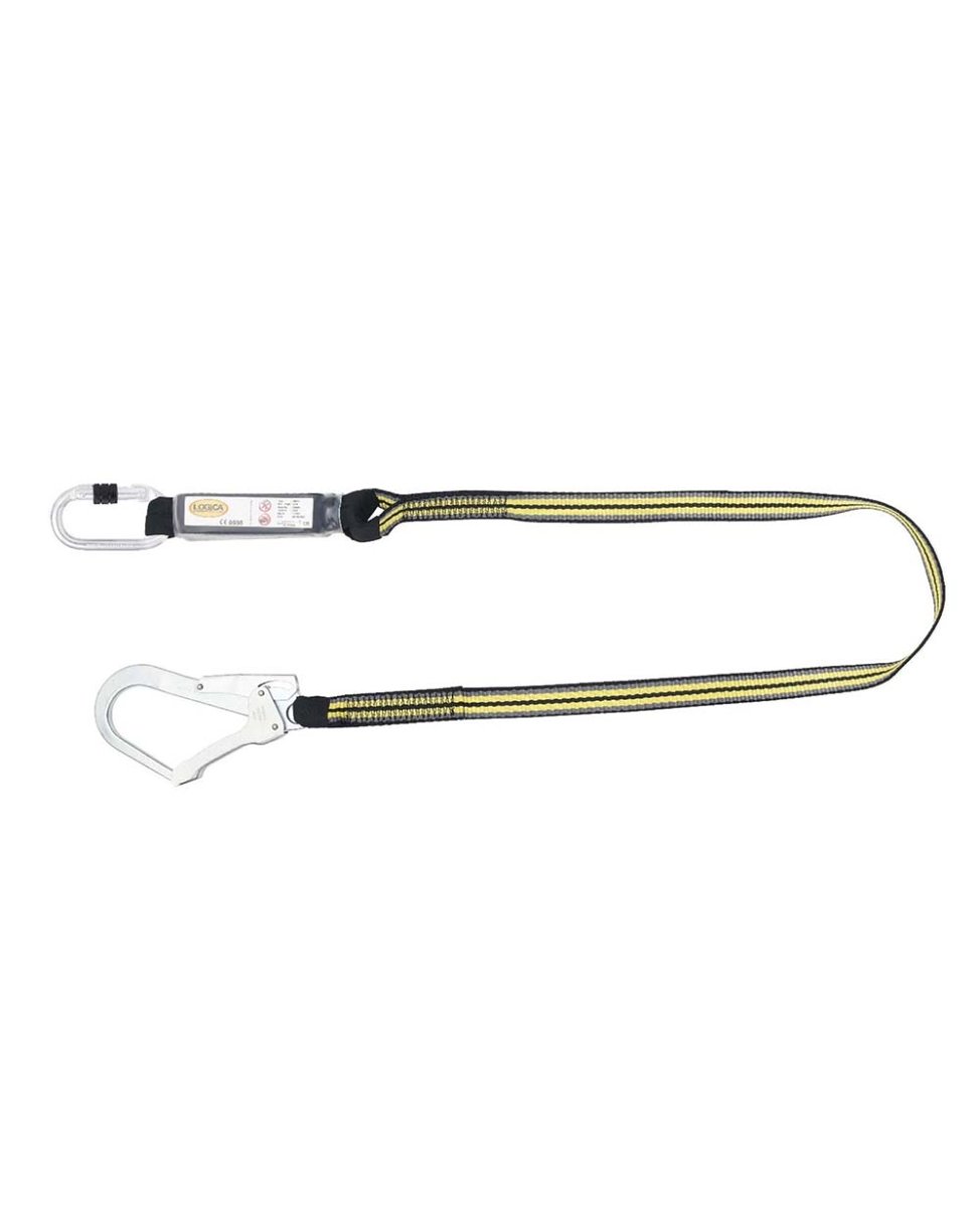 Cordino anticaduta con assorbitore di energia. Lunghezza 1,8 metri. In un lato un moschettone a ghiera, sull’altro connettore a grande apertura (55 mm) con chiusura di sicurezza a doppia leva.