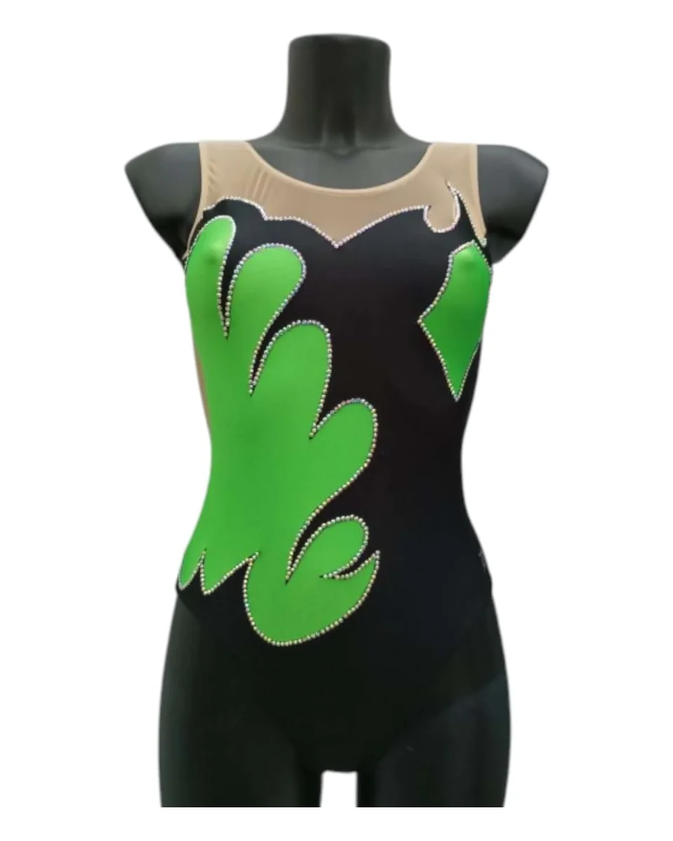 Questo costume, realizzato su una base nera con inserti verde brillante impreziositi da strass, unisce eleganza e funzionalità . Le spalle e la scollatura posteriore sono rifinite con una rete color pelle trasparente, che dona leggerezza e un effetto sofisticato senza appesantire il design.