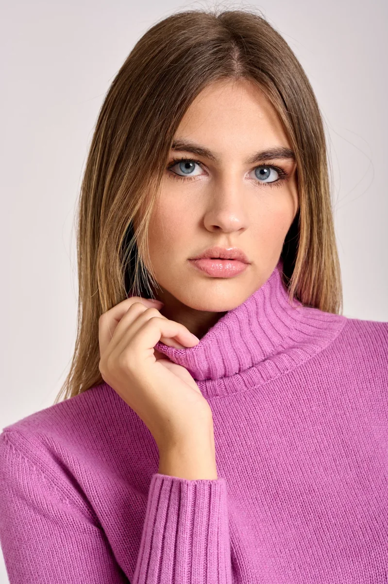 Maglia con collo alto a costine che aggiunge struttura e colore, la lavorazione conferisce un aspetto rasato compatto. Manica larga polsino e fondo a costine vestibilitร regolare. La modella รจ alta 1,78cm e indossa una taglia 42