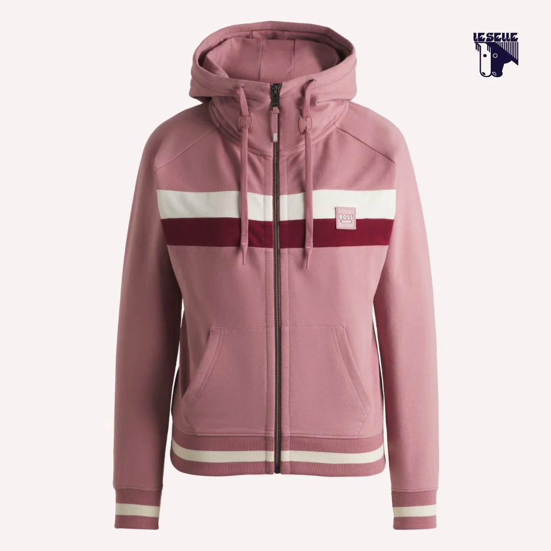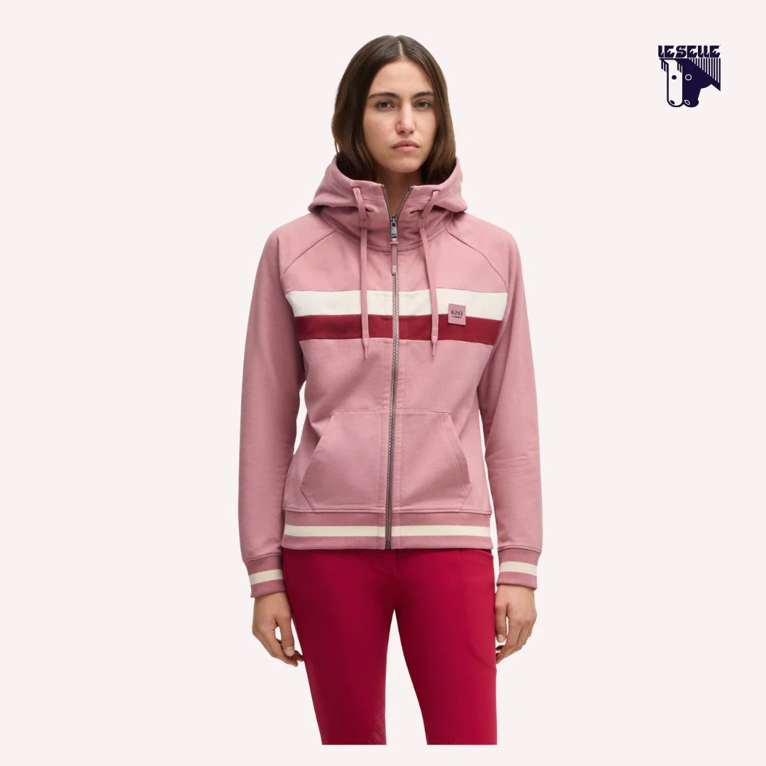 Felpa equitazione Boss Cotone felpato Morbida e calda Full zip Collo alto Cappuccio Elastico in vita e sui polsini Fasce orizzontali in contrasto