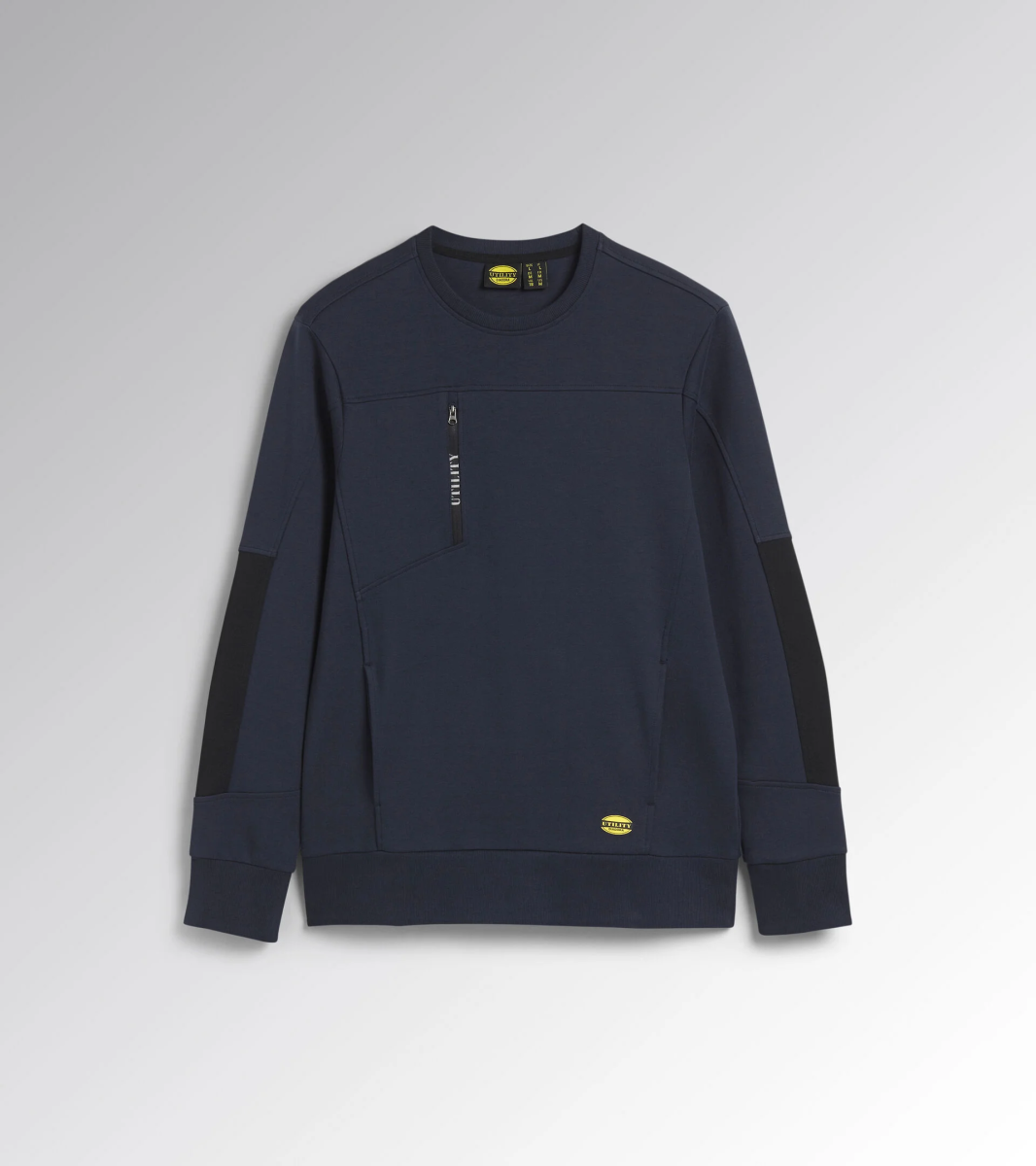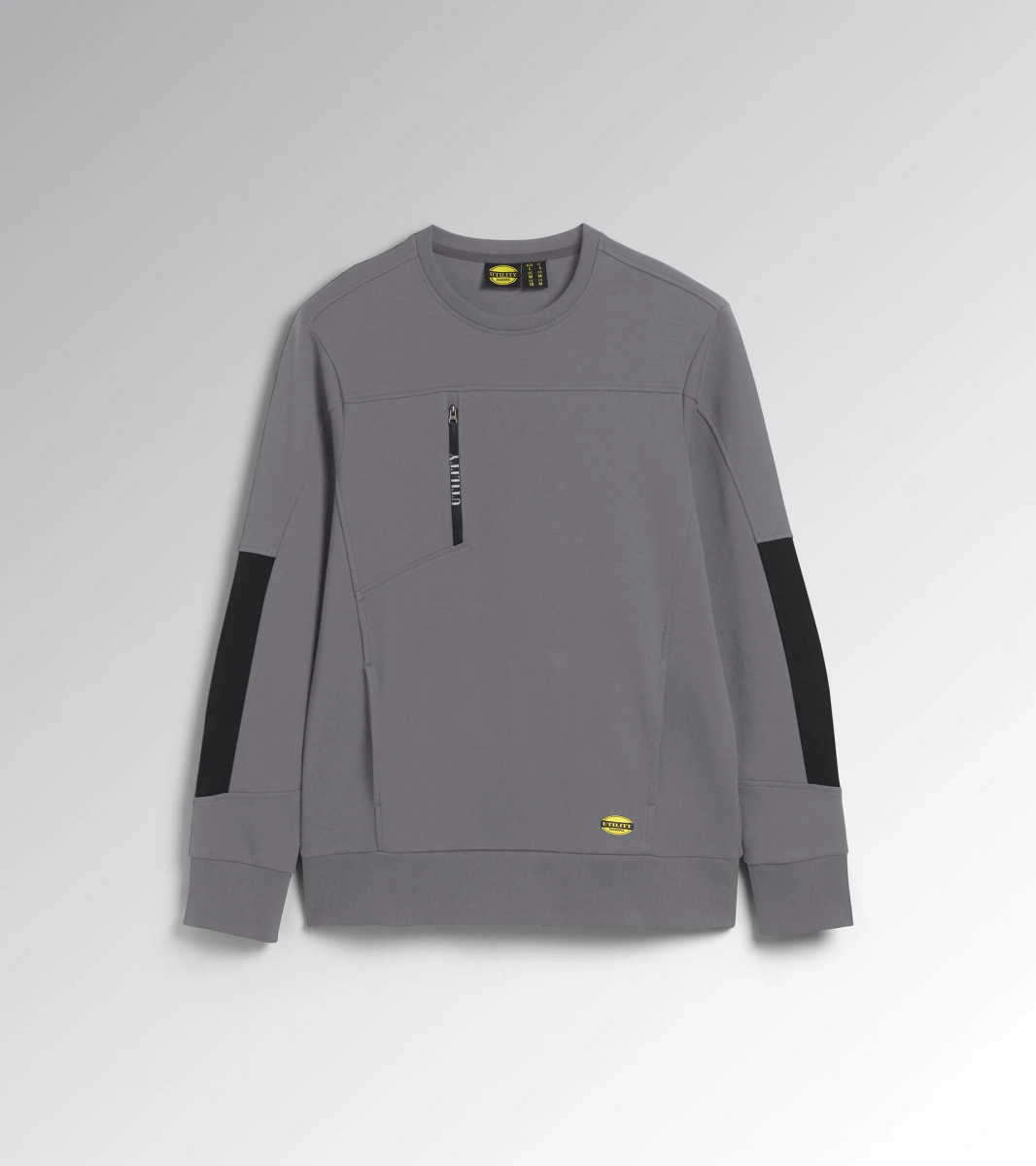 Felpa leggera in interlock girocollo con inserti laterali neri sulle maniche. Maniche ergonomiche. Due tasche aperte laterali e una tasca frontale con zip. Collo, polsini e fondo in costina elasticizzata.