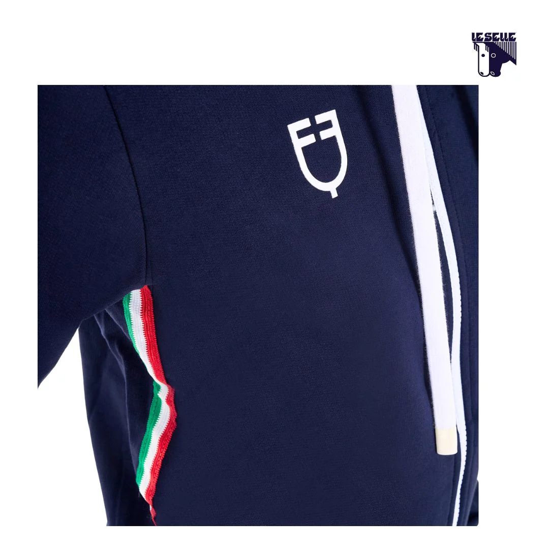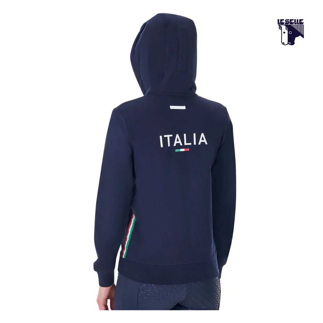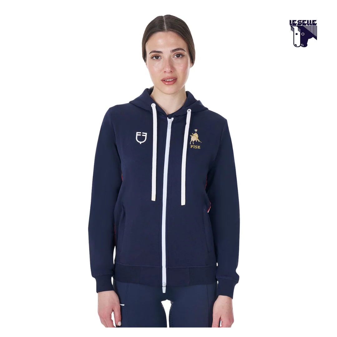 Felpa donna Equestro x Fise Cotone garzato Leggera Full zip bianca Cappuccio integrato con cordini bianchi Due tasche con zip Loghi frontali Equestro e Fise Scritta sulla schiena Bordo tricolore lungo il fianco