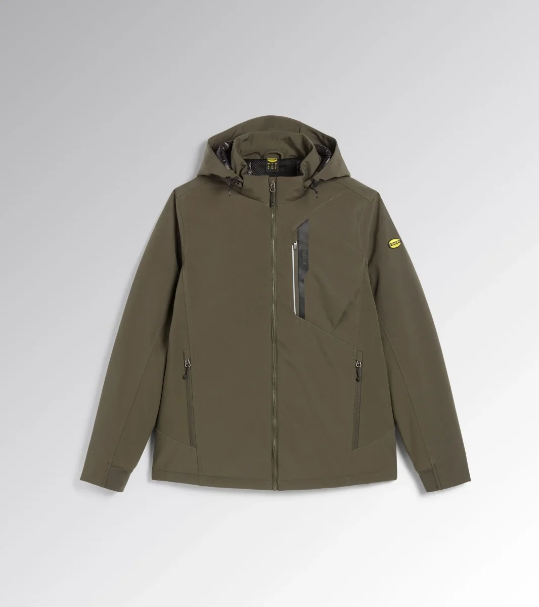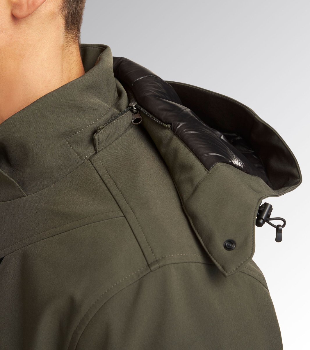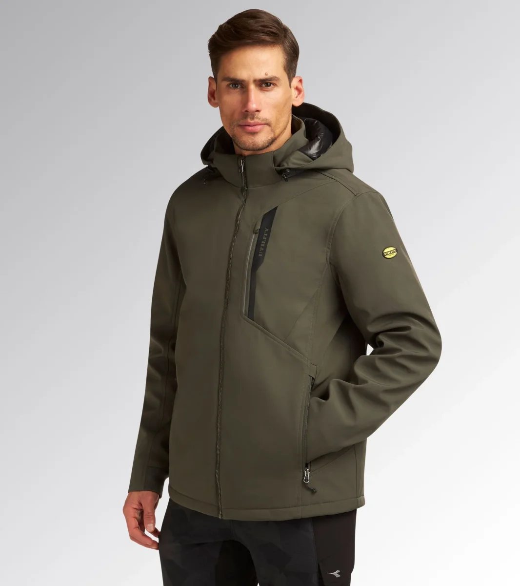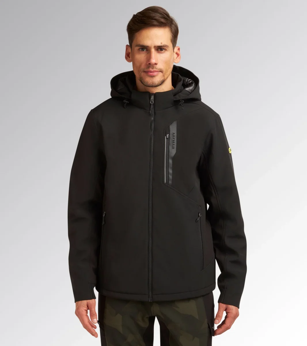 Giacca in softshell con imbottitura leggera, antivento e trattamento idrorepellente. Inserto salvabarba, cappuccio staccabile con doppia regolazione e frontino sagomato. Due tasche laterali e una tasca frontale con zip, dettagli reflex e stampa termonastrata personalizzata Utility. Maniche ergonomiche. Inserti interni in 3D mesh con apertura sul carrรจ posteriore per una traspirabilitร ottimale. Fondo regolabile con coulisse e parte posteriore piรน lunga per miglior vestibilitร .