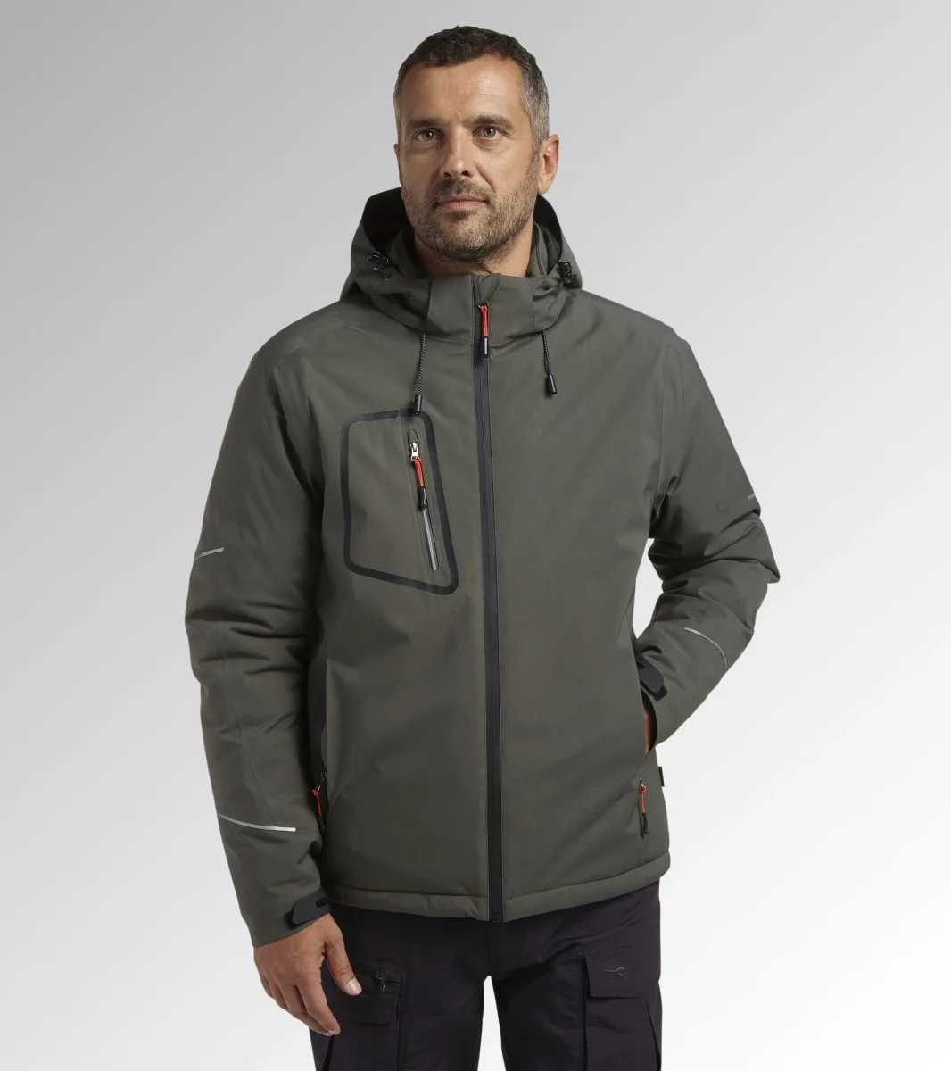 Giacca imbottita antipioggia certificata EN343 con ovatta termica 3M. Cappuccio staccabile con tripla regolazione e frontino sagomato. 2 tasche laterali e una tasca frontale con zip waterproof. Doppia tasca interna e regolazione fondo con coulisse. Manica ergonomica e regolazione polsi con velcro. Parte posteriore allungata per una miglior vestibilitร . Cuciture termonastrate e dettagli reflex.