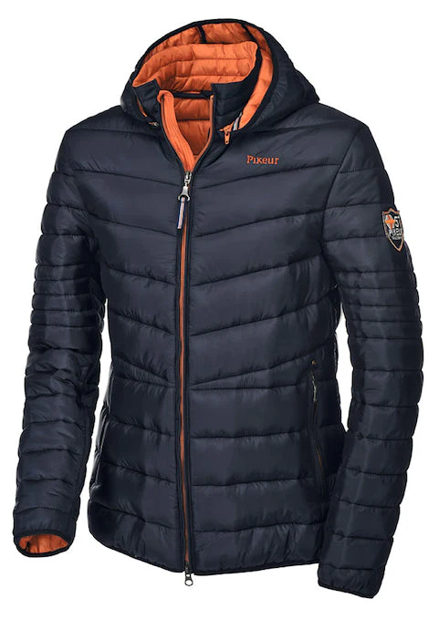 Giacca Pikeur Aaron Imbottitura di media pesantezza Taglio corto Cappuccio staccabile Inserti arancio Tasche con zip Logo Pikeur sul petto e sulla manica sinistra
