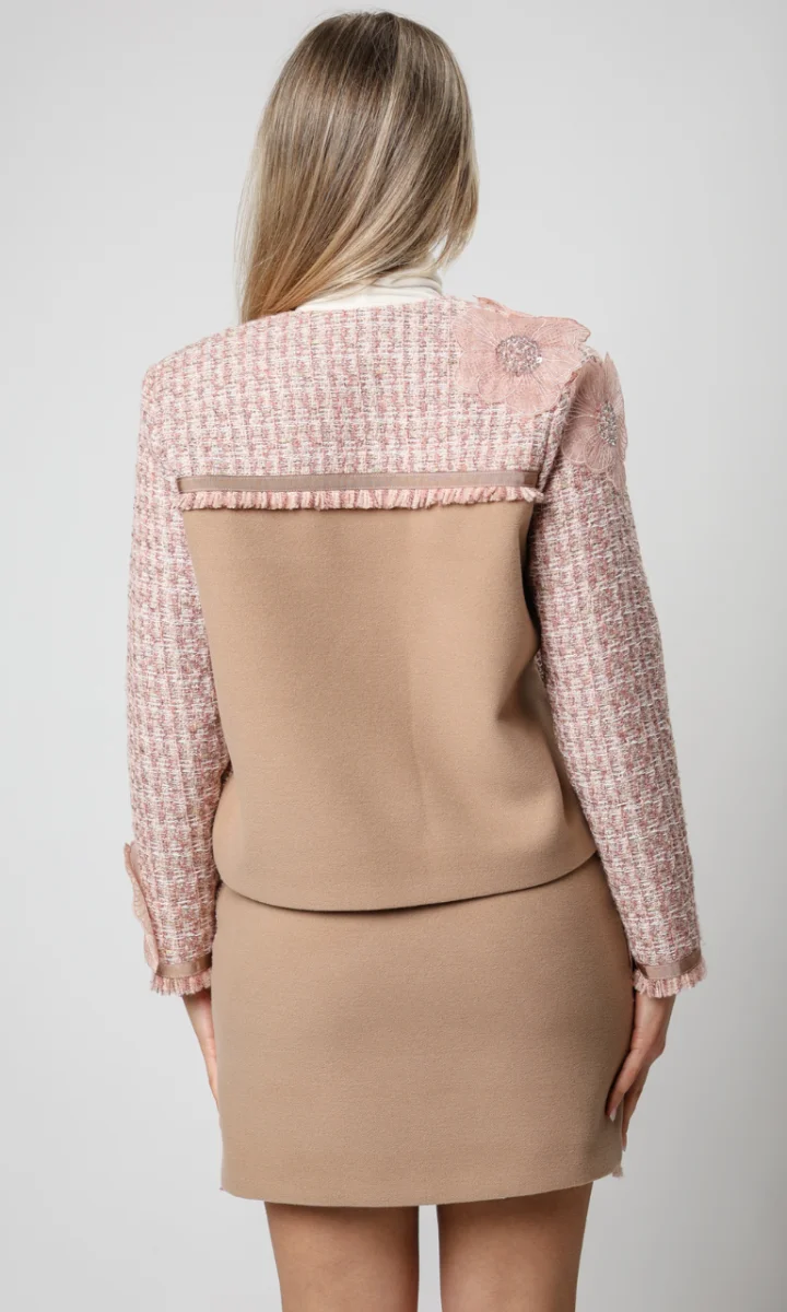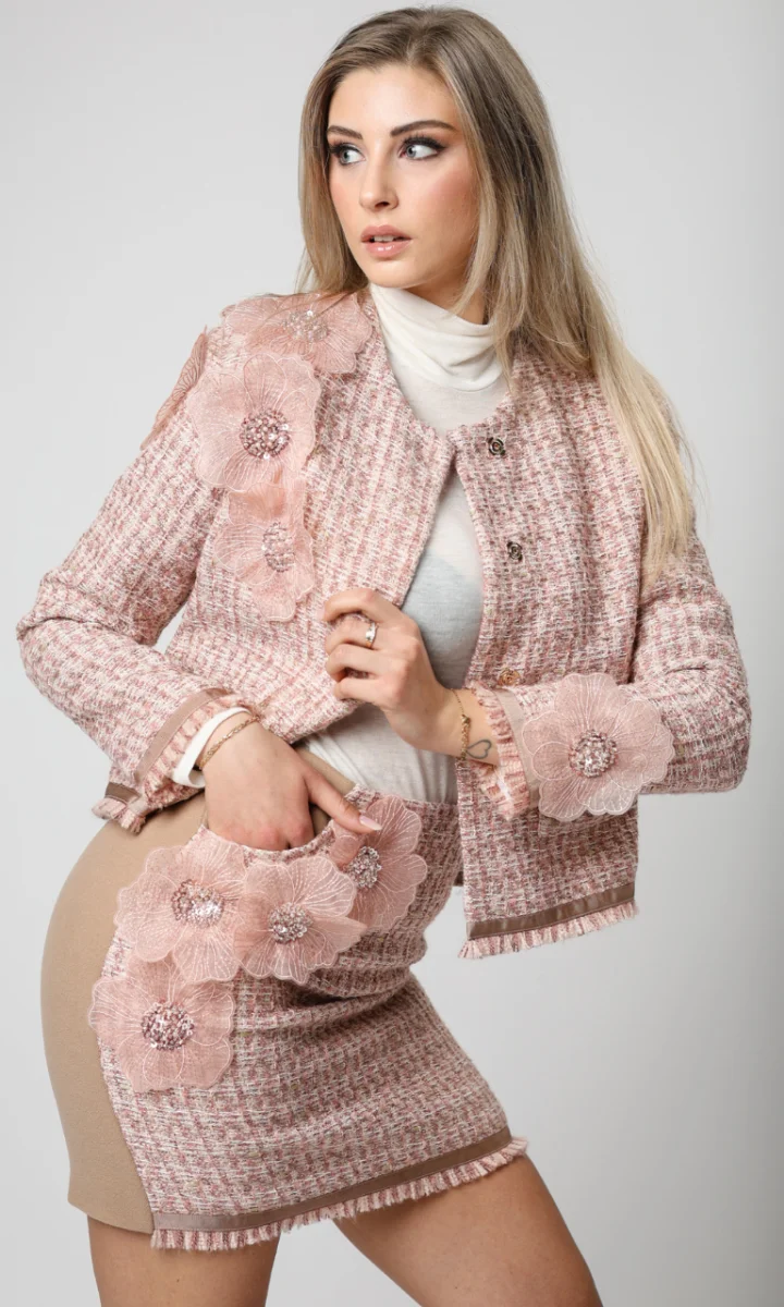Questa giacca tweed donna in rosa cipria rappresenta lโeleganza senza tempo. Realizzata con un morbido tweed strutturato, presenta applicazioni floreali 3D ricamate e illuminate da dettagli scintillanti che catturano la luce in modo raffinato. Il taglio corto e il bordo con frange rendono questo capo un vero statement di stile, perfetto per chi desidera un look chic e ricercato.