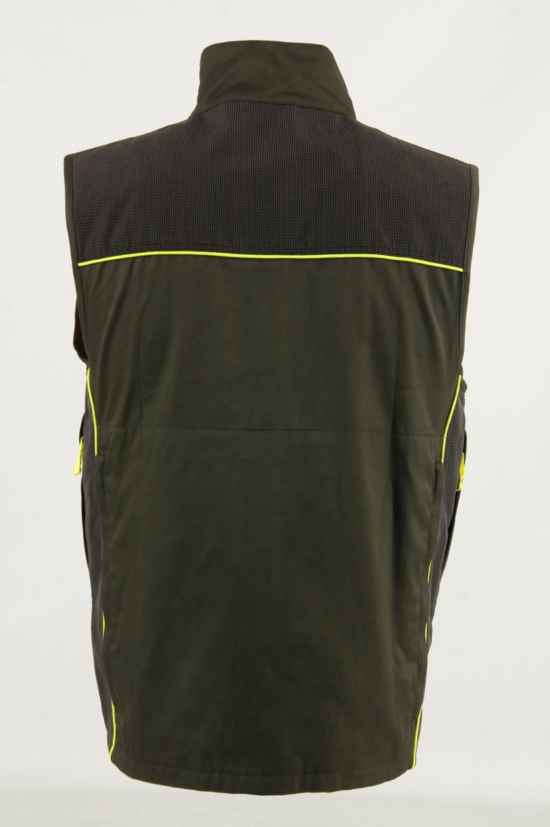 Gilet da caccia verde con bordini alta visibilità, dettagli in tessuto tecnico impermeabile, fondo in tessuto poli-cotone. Con 2 grandi tasche frontali oblique con chiusura a zip, e altre due con chiusura con patta, tasca porta GPS lato cuore, ampio carniere.