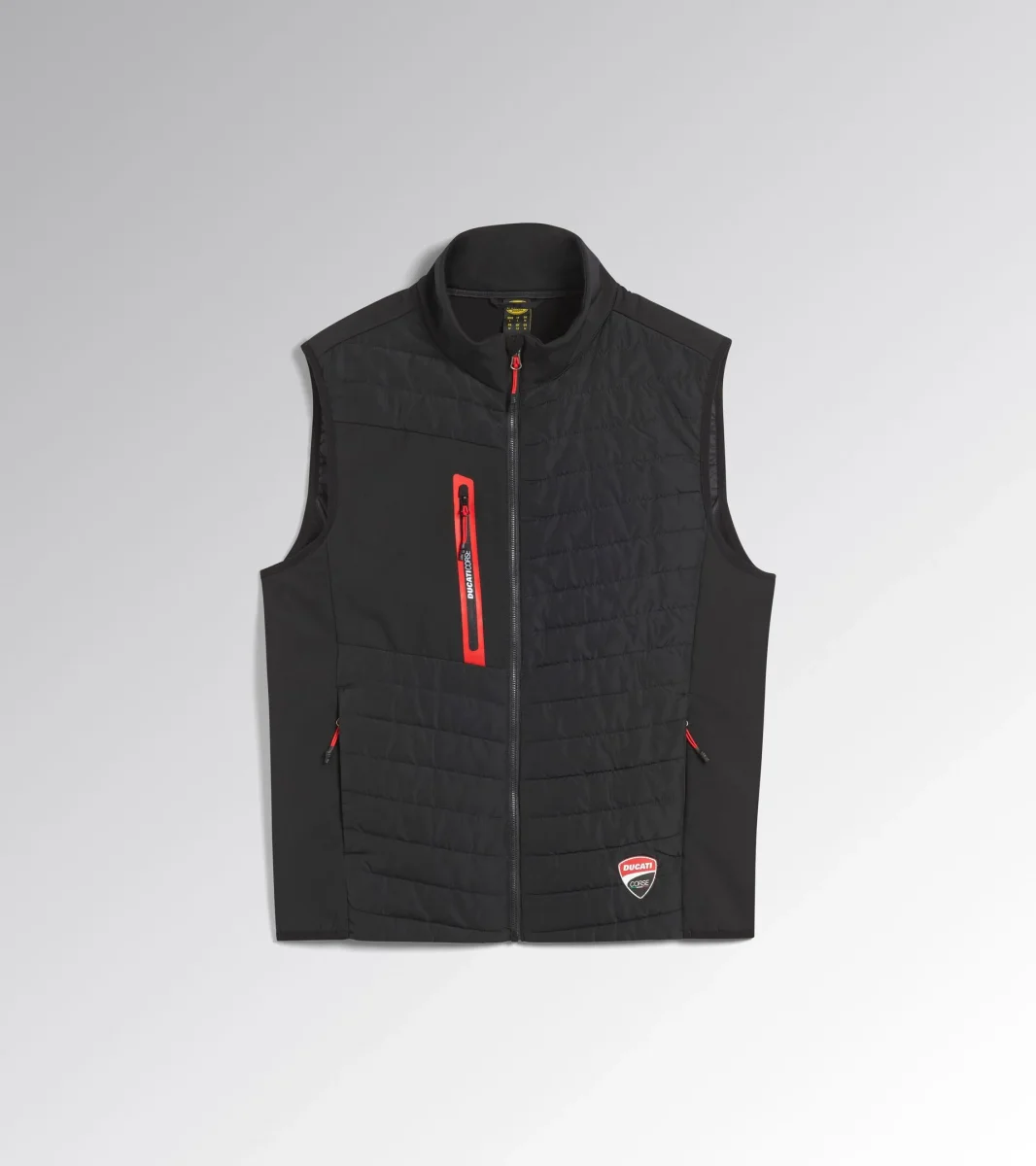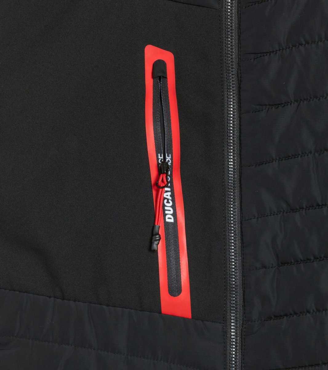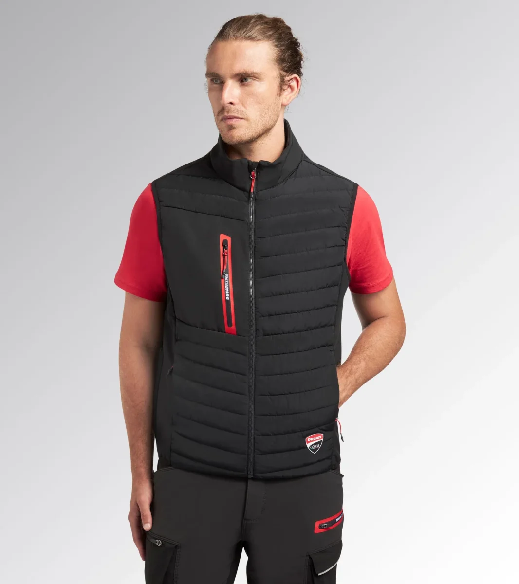 Gilet imbottito leggero. Collo in piedi con inserto salvabarba. Due tasche laterali e una tasca petto con dettaglio termonastrato e personalizzazione DUCATI CORSE, tutte con chiusura zip. Giro manica e fondo elasticizzati con Lycra. Finiture rosse a contrasto. Emblema Ducati Corse sul lato frontale.