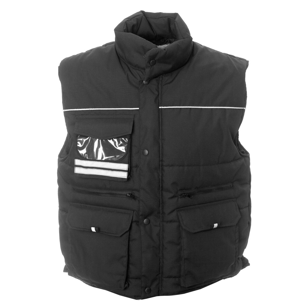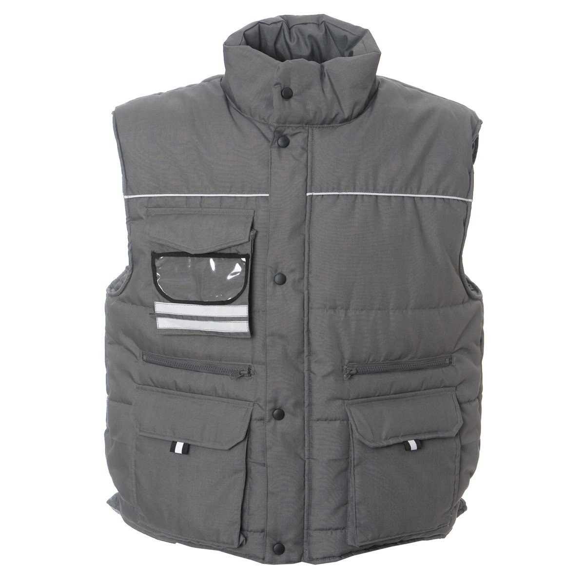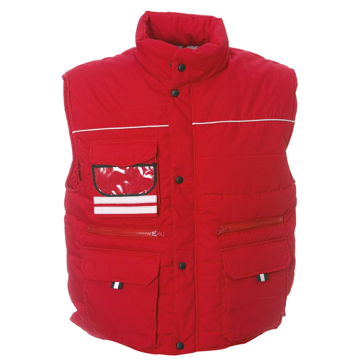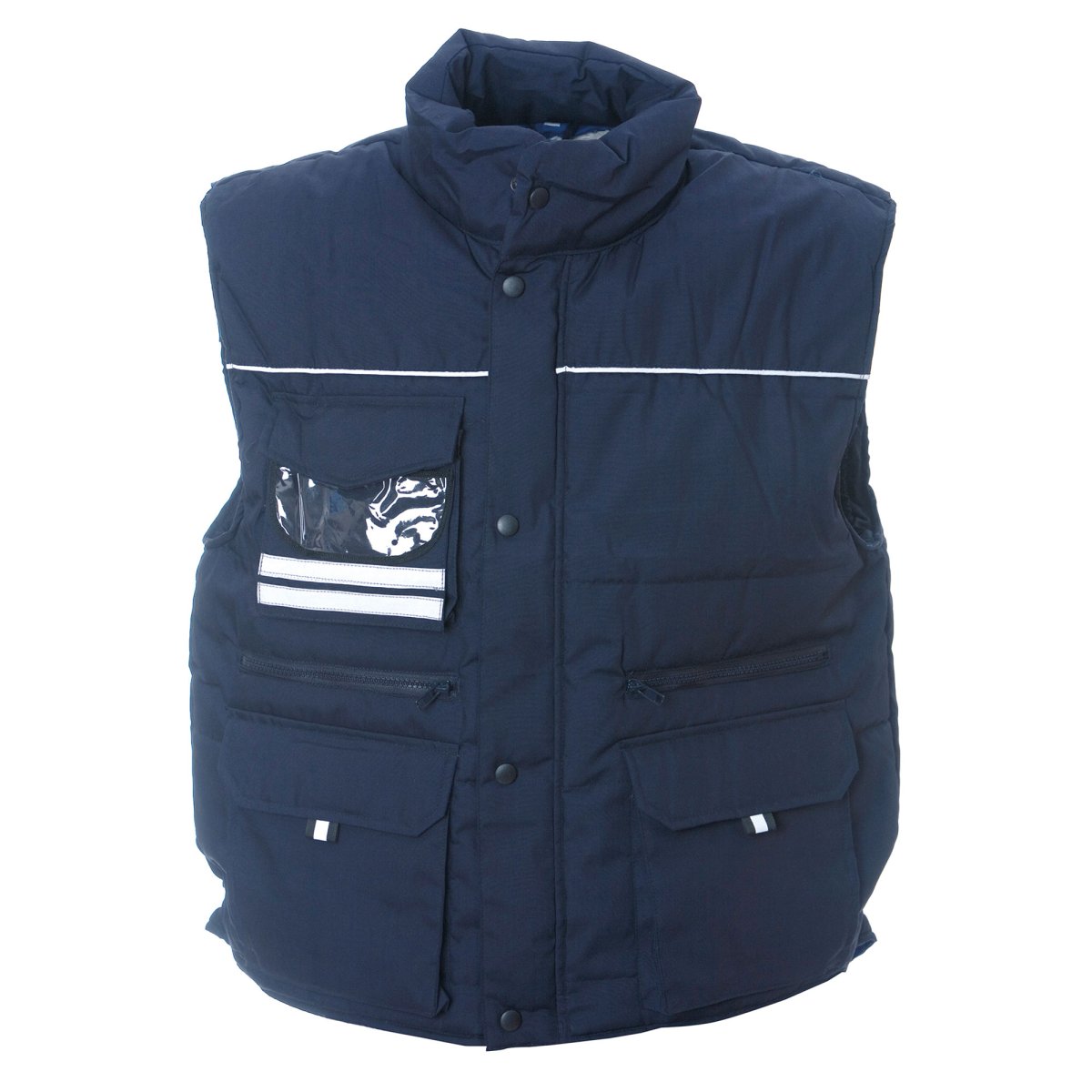 Gilet con profili rinfrangenti, tasca sul petto con portabagde a scomparsa, due tasche con patta e chiusura in velcro, due tasche con zip con fodera rinforzata per utensili, una tasca interna portafoglio con velcro, un taschino interno portacellulare, elastico antivento nel giromanica, elastico stringifianchi, bottoni automatici in metallo. Solo per colore Blu disponibile TG.4XL.