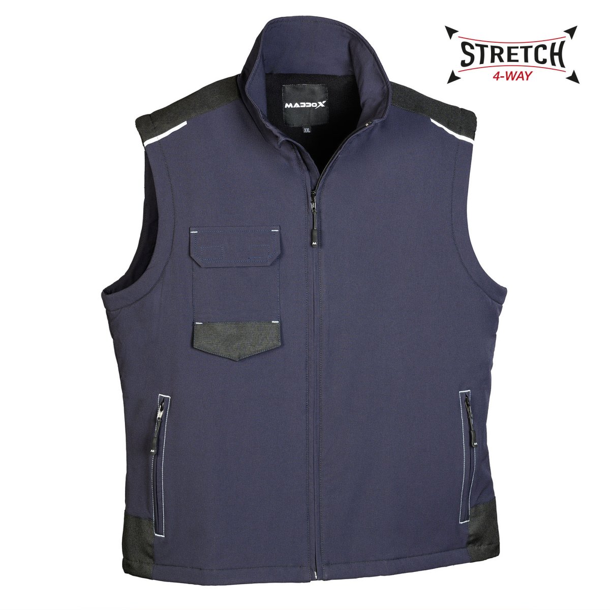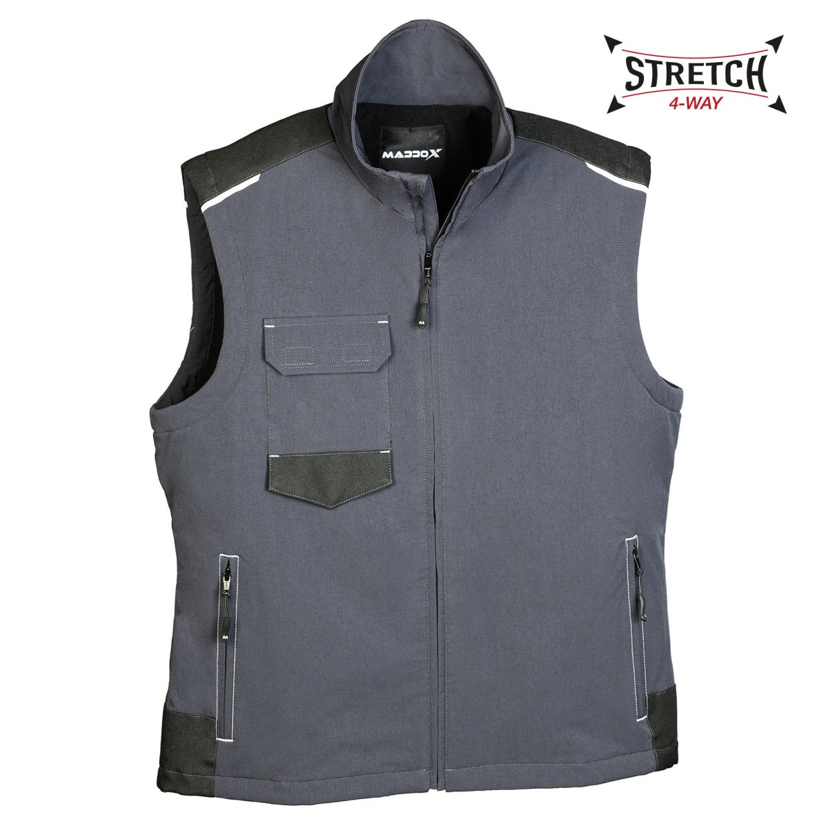 Gilet Maddox in tessuto stretch 4-way idrorepellente ad alta traspirabilitร e rapida asciugatura, con inserti in poliestere Oxford e fodera interna in pile, tasca sul petto con pattina e chiusura in velcro, due tasche con zip coperta, dettagli rifrangenti sulle spalle.