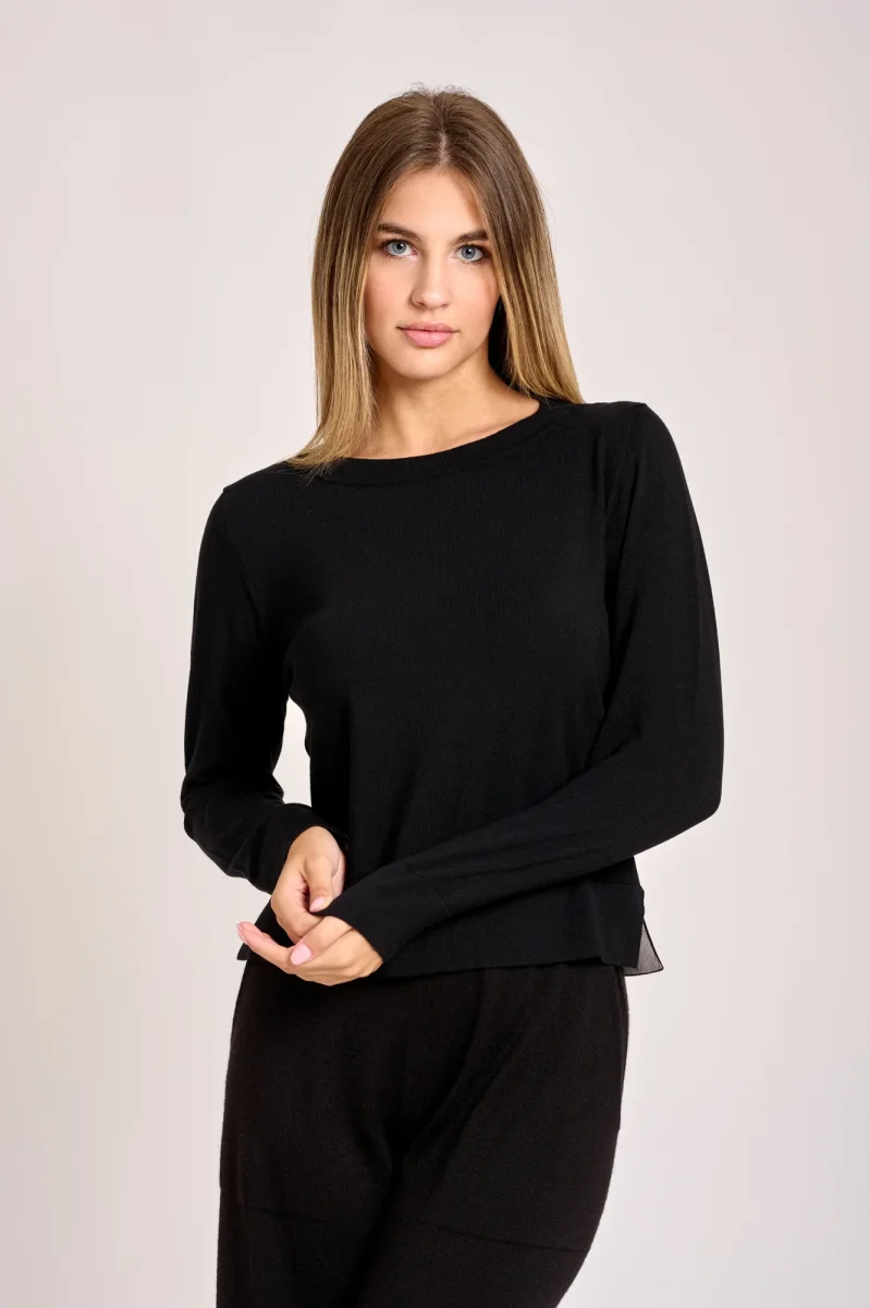 La maglia presenta una scollatura girocollo manica larga, nella parte interna del collo e in quella inferiore sui fianchi si intravede un colore contrastante, un capo ultra leggero per chi ha allergia alla lana. La modella รจ alta 1,78cm e indossa una taglia 42