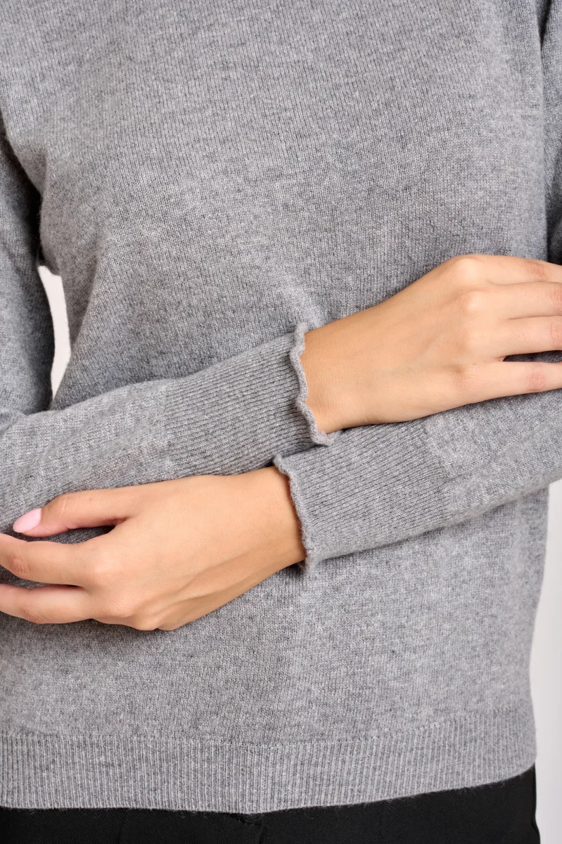 Maglia girocollo a costine verticali, sui polsi fianchi e girocollo lavorazione rasata. La modella รจ alta 1,78cm e indossa una taglia 42
