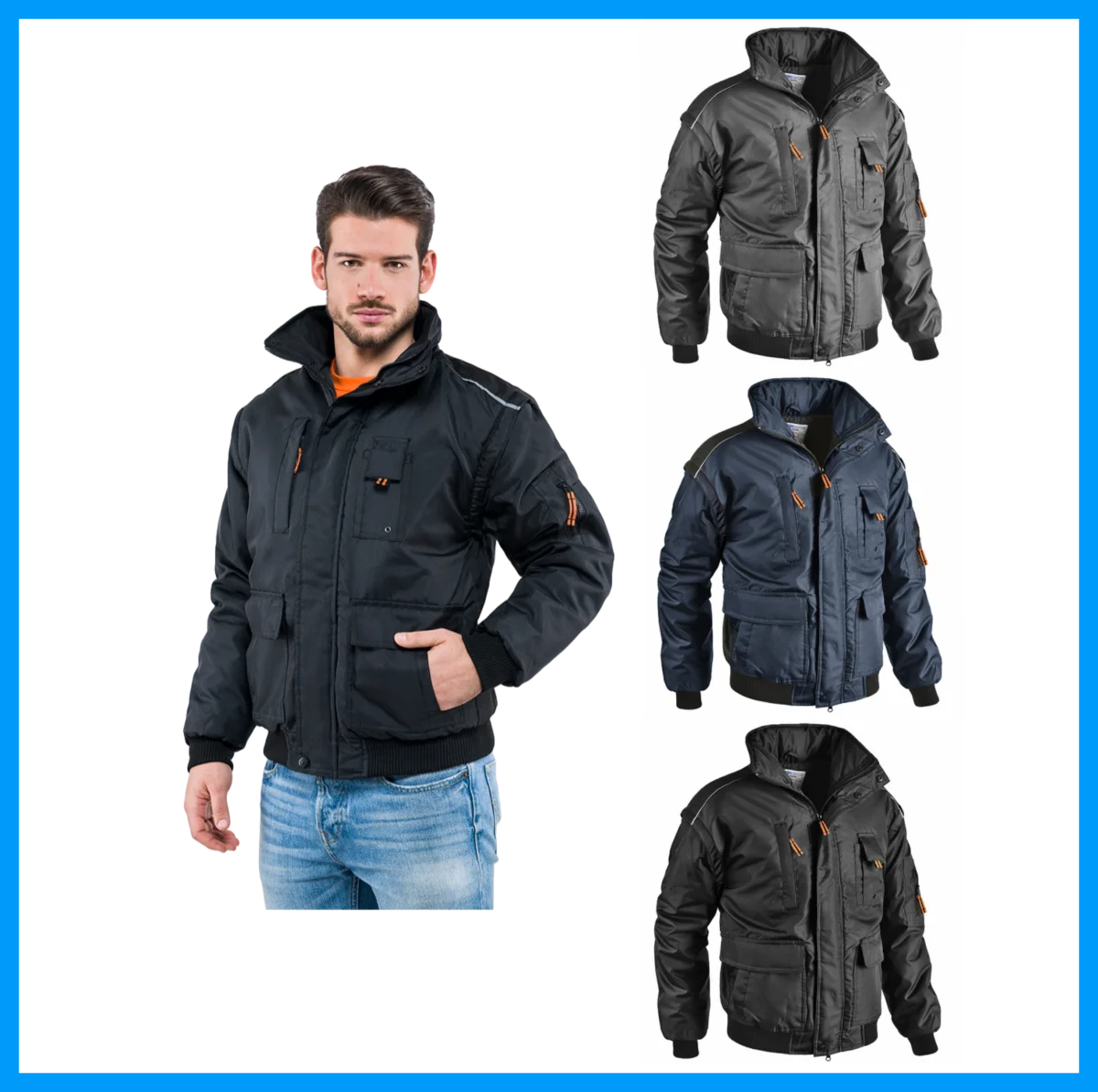 Giubbotto da tempo libero e da lavoro con tasche e cappuccio richiudibile.