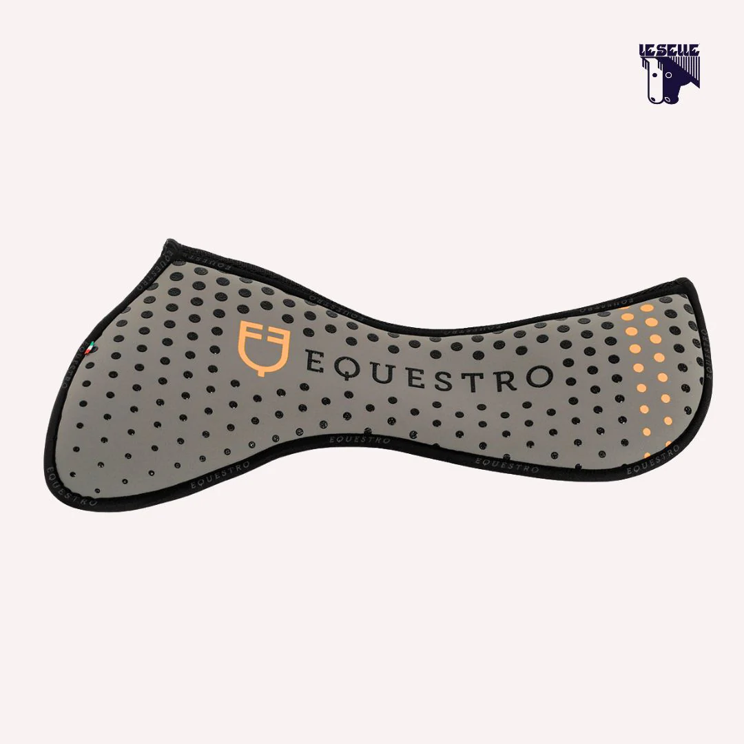 Compensatore half pad Equestro Close contact Memory foam: assorbe gli urti e distribuisce uniformemente la pressione Spine free con inserto in 3D che permette il passaggio dell’aria sotto la sella Tessuto esterno con grip Struttura particolare che rende il pad elastico e privo di torsioni