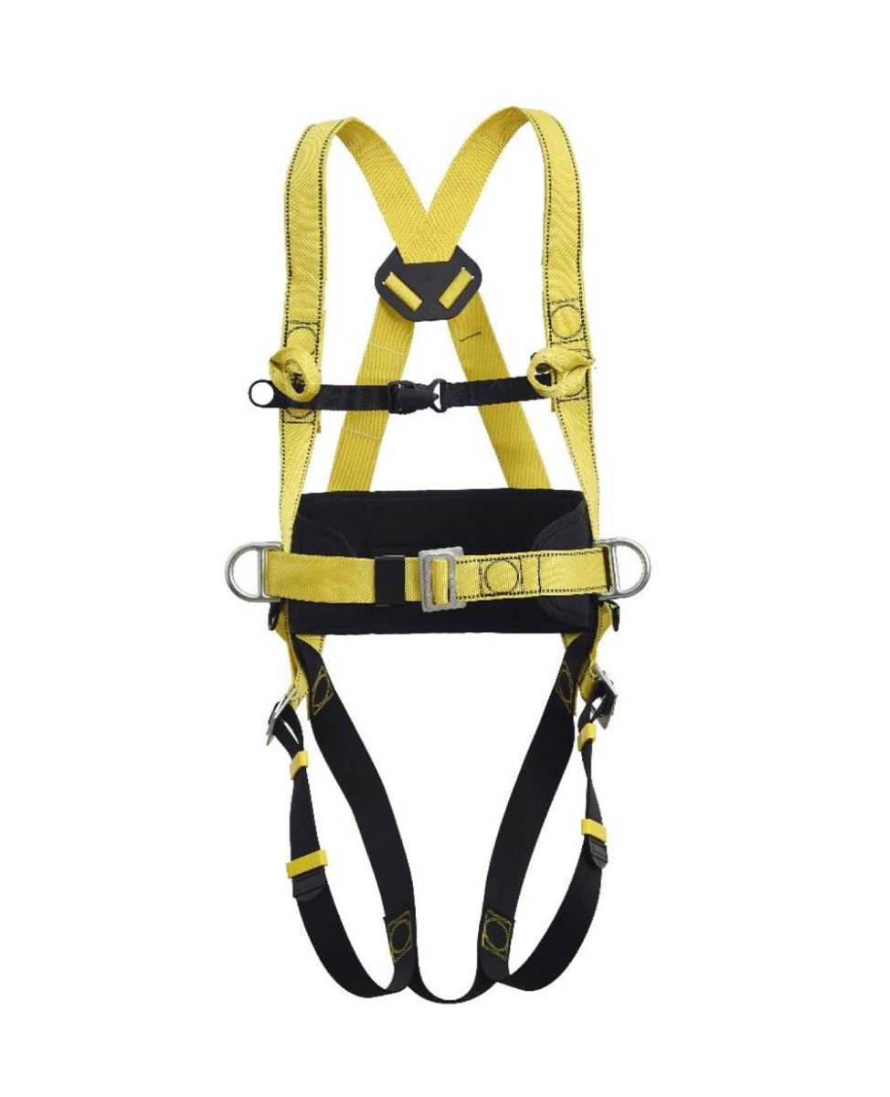Imbracatura anticaduta con cinturone di posizionamento anatomico, anello di ancoraggio dorsale, doppio aggancio tessile frontale, due anelli di posizionamento laterali. Cosciali regolabili. Fascia sottoglutei di sostegno. Cinturino di connessione regolabile ed apribile sul petto DPI di III° categoria
