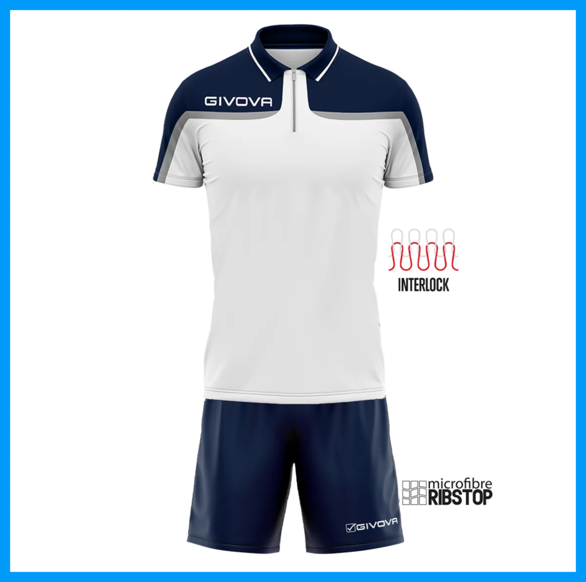 POLO: 100% interlock poliestere 140grammi; mezza zip al colletto, logo ricamato; colletto e giromaniche in costina. PANTALONCINI: 100% poliestere microfibra ribstop; tasche laterali; logo ricamato.