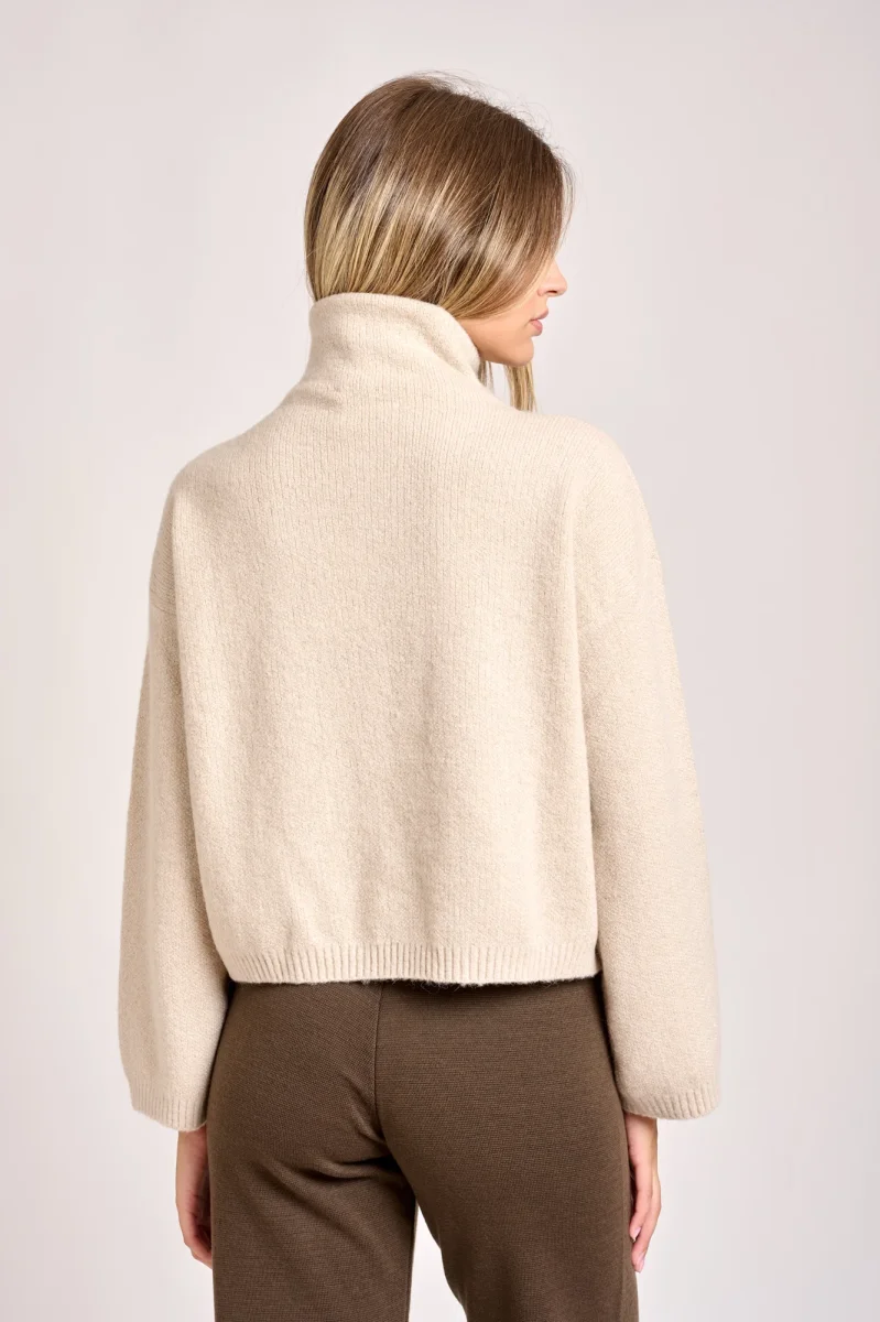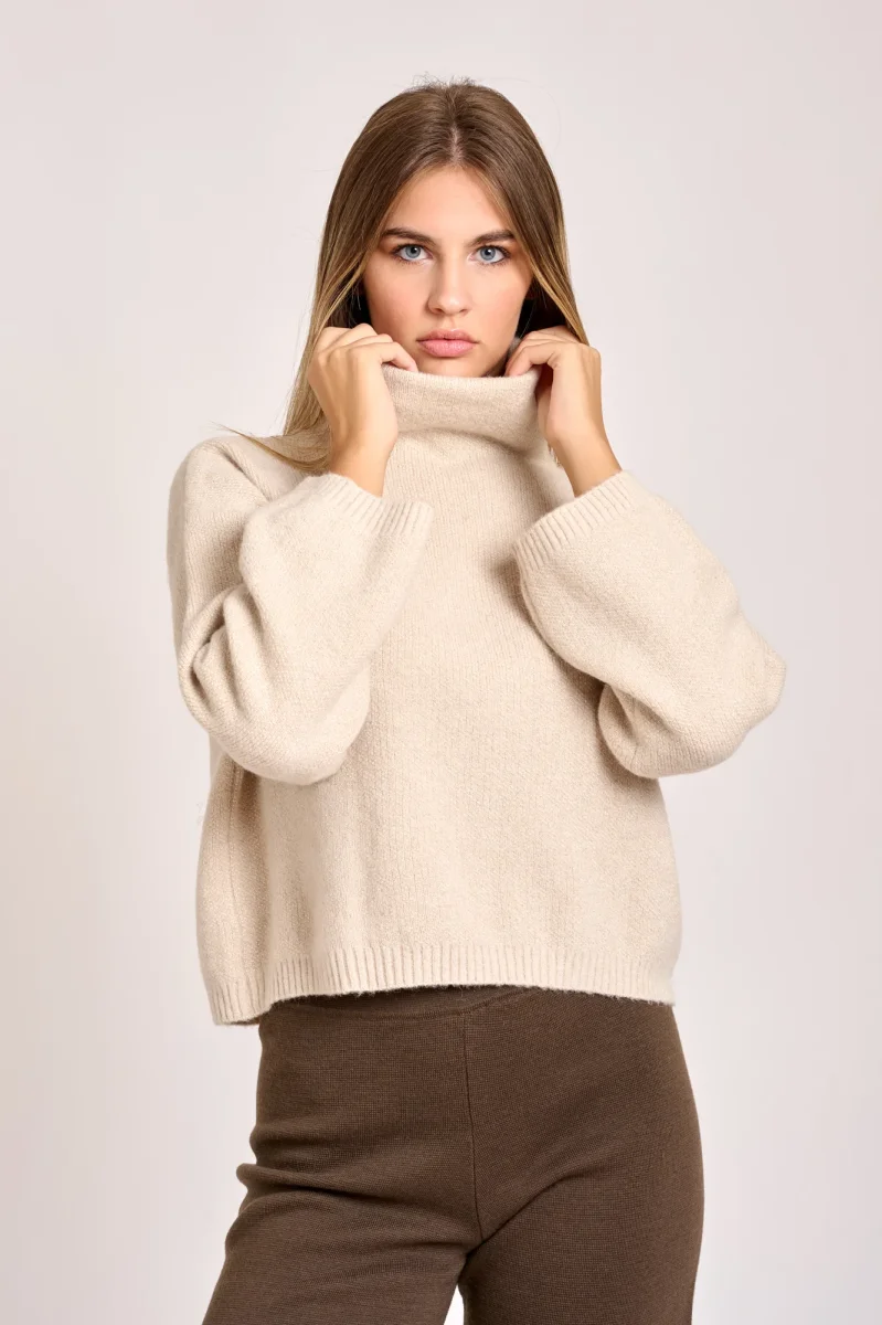 Pullo- over colore stucco stile semplice e classico con manica lunga, presenta una lavorazione con trama ampia vestibilitร collo alto.