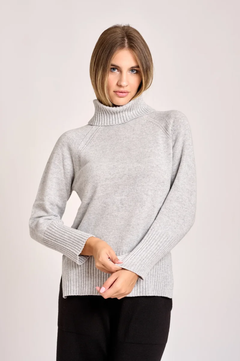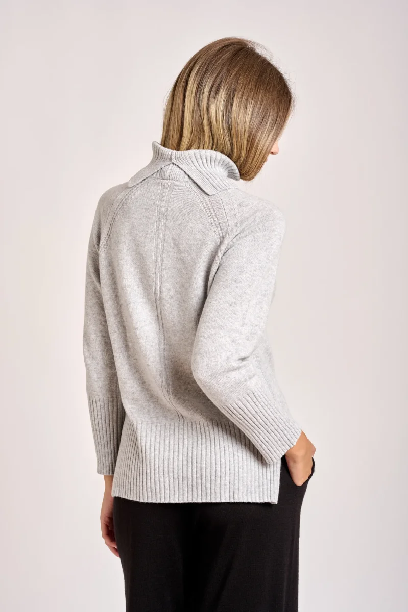 Maglia collo a alto a coste con spacchetti sul dietro, lavorazione rasata spacchi lungo i fianchi. La maglia classica e versatile adatta a diverse occasioni informali o semi formali ideale per la stagione fredda. La modella รจ alta 1,78cm e indossa una taglia 42