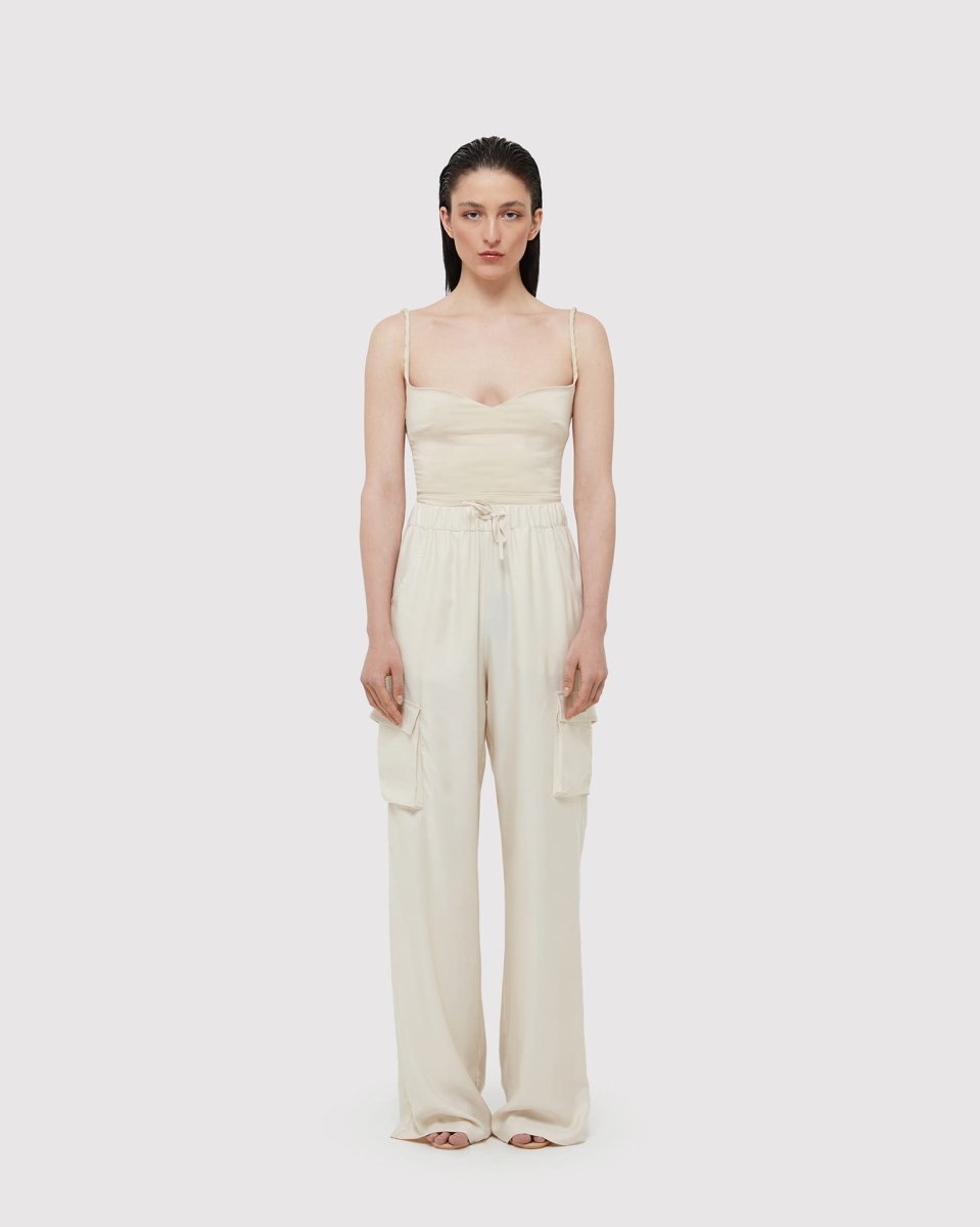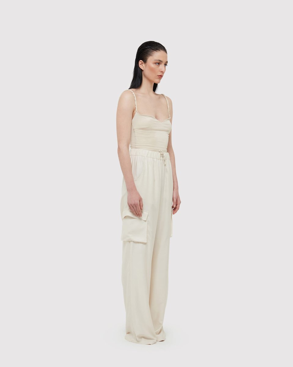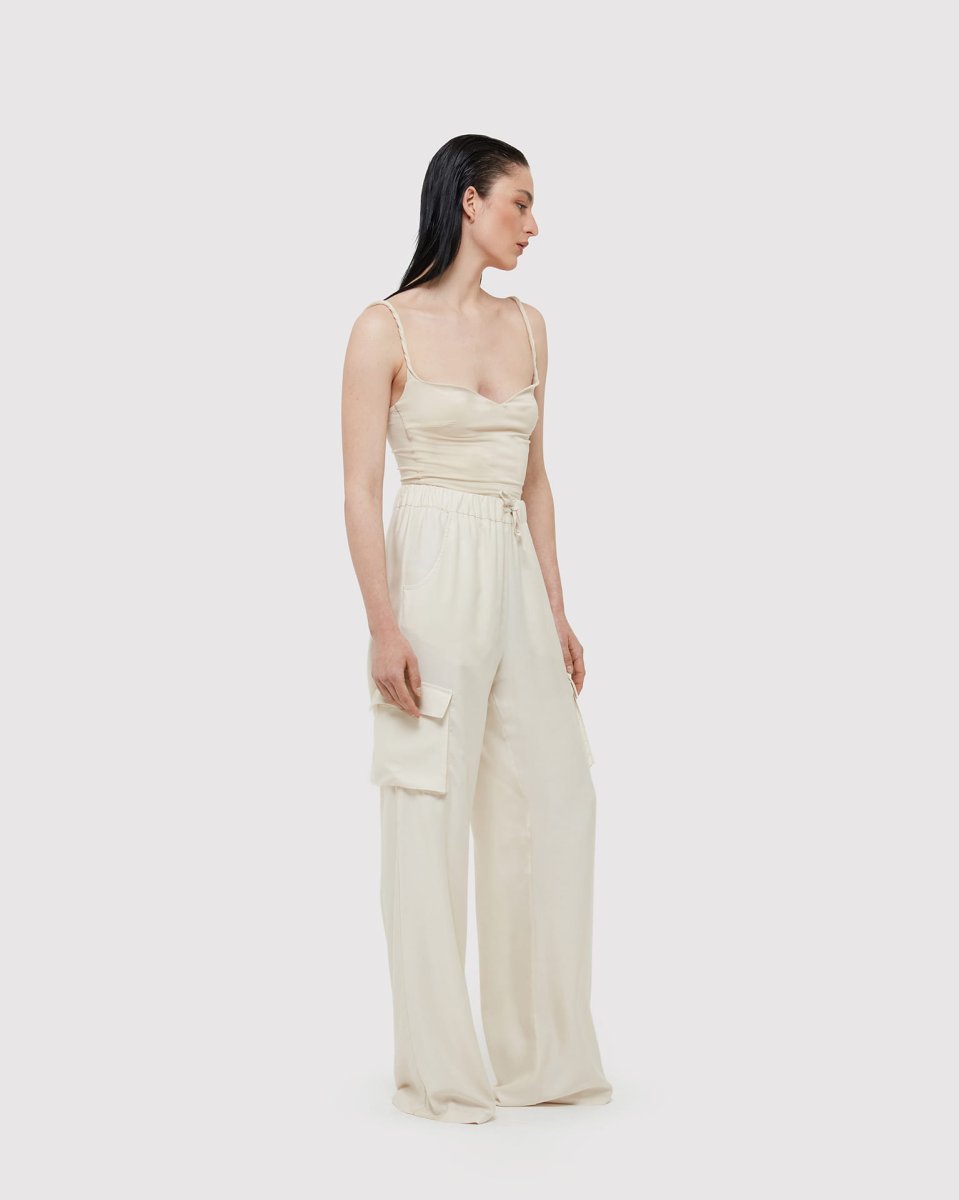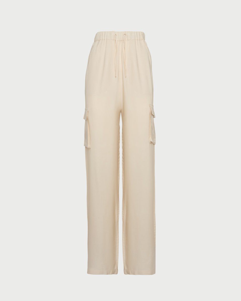 Ecrรน Pantalone Cargo oversize a vita alta con tasche laterali e vita elasticizzata in Bamboo e Aloe Vera. Made in Italy.