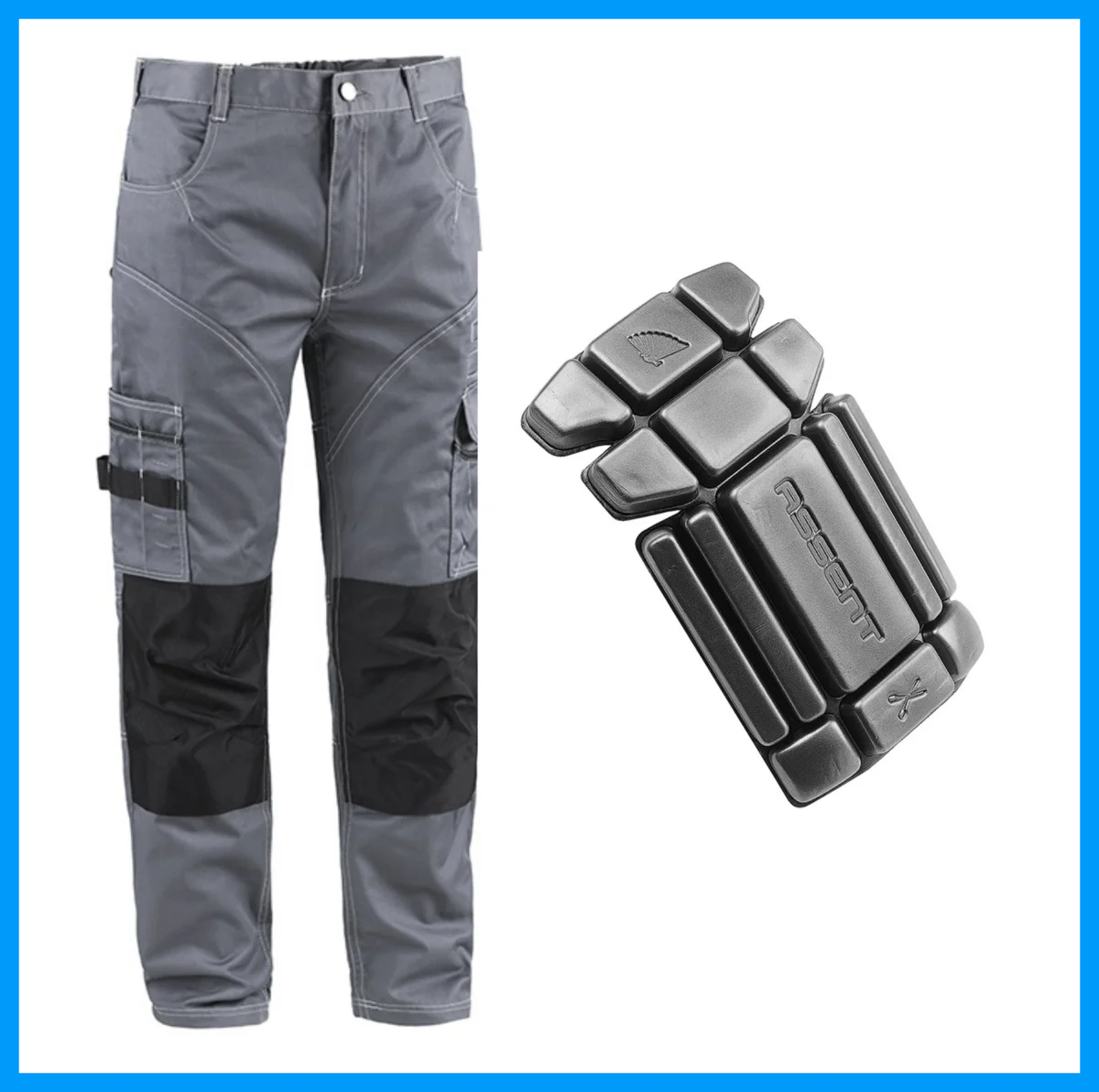 Offerta che comprende i pantaloni da lavoro Myday Travaux di colore grigio e una confezione di ginocchiere universali.