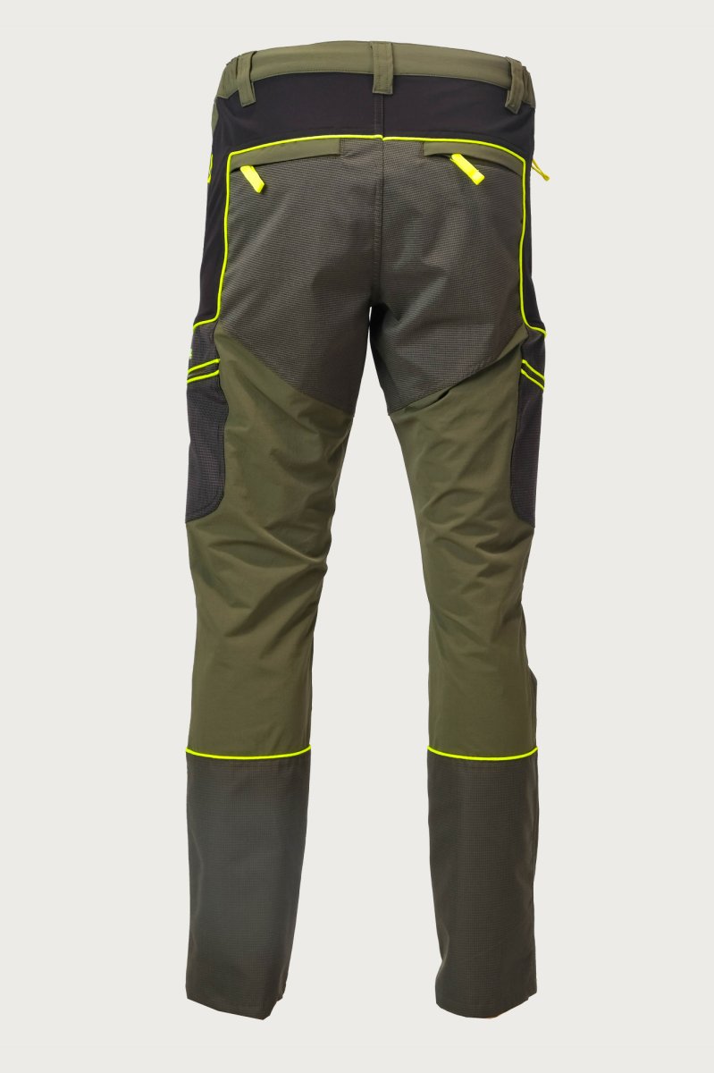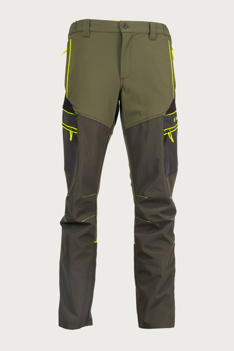 Pantalone elasticizzato da caccia in tessuto spandex. Disponibile sia in colore verde con rifiniture in tessuto tecnico giallo alta visibilitร , sia in versione total green per essere indossato in qualsiasi occasione. I rinforzi in tessuto tecnico simil kevlar rendono il capo impermeabile e anti spino.