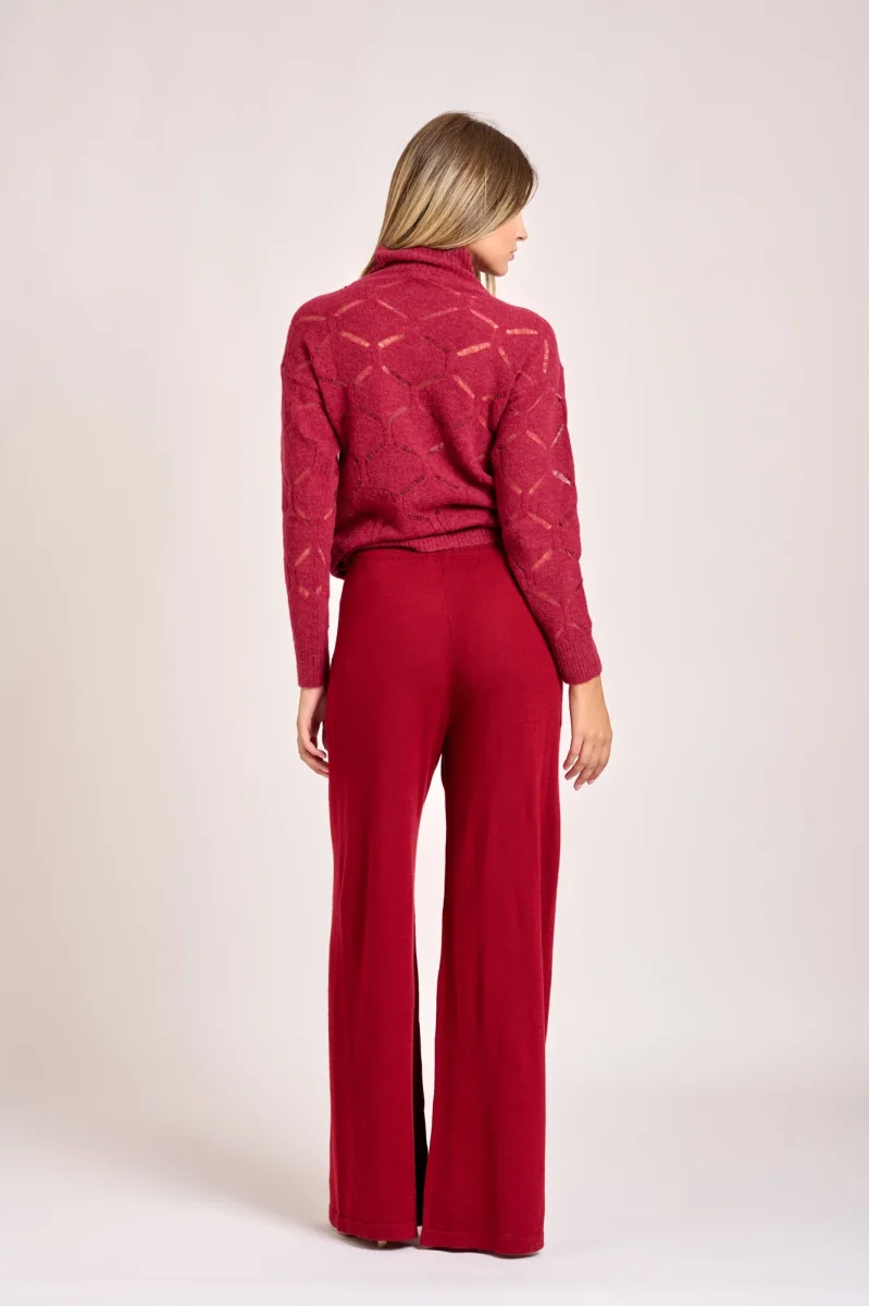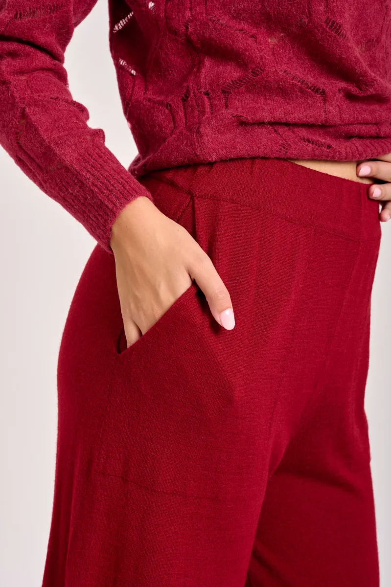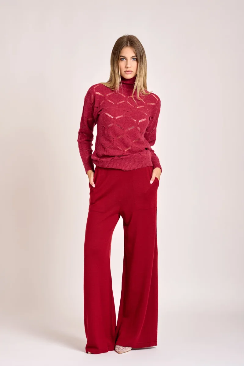Realizzato in un tessuto a maglia fine, con trama a coste sottili che conferisce una leggera texture verticale. Pantalone a gamba larga taglio semplice e una linea fluida, elastico in vita e tasche con taglio laterale che lo rendono morbido e confortevole.ย La modella รจ alta 1,78 e indossa una taglia 42.