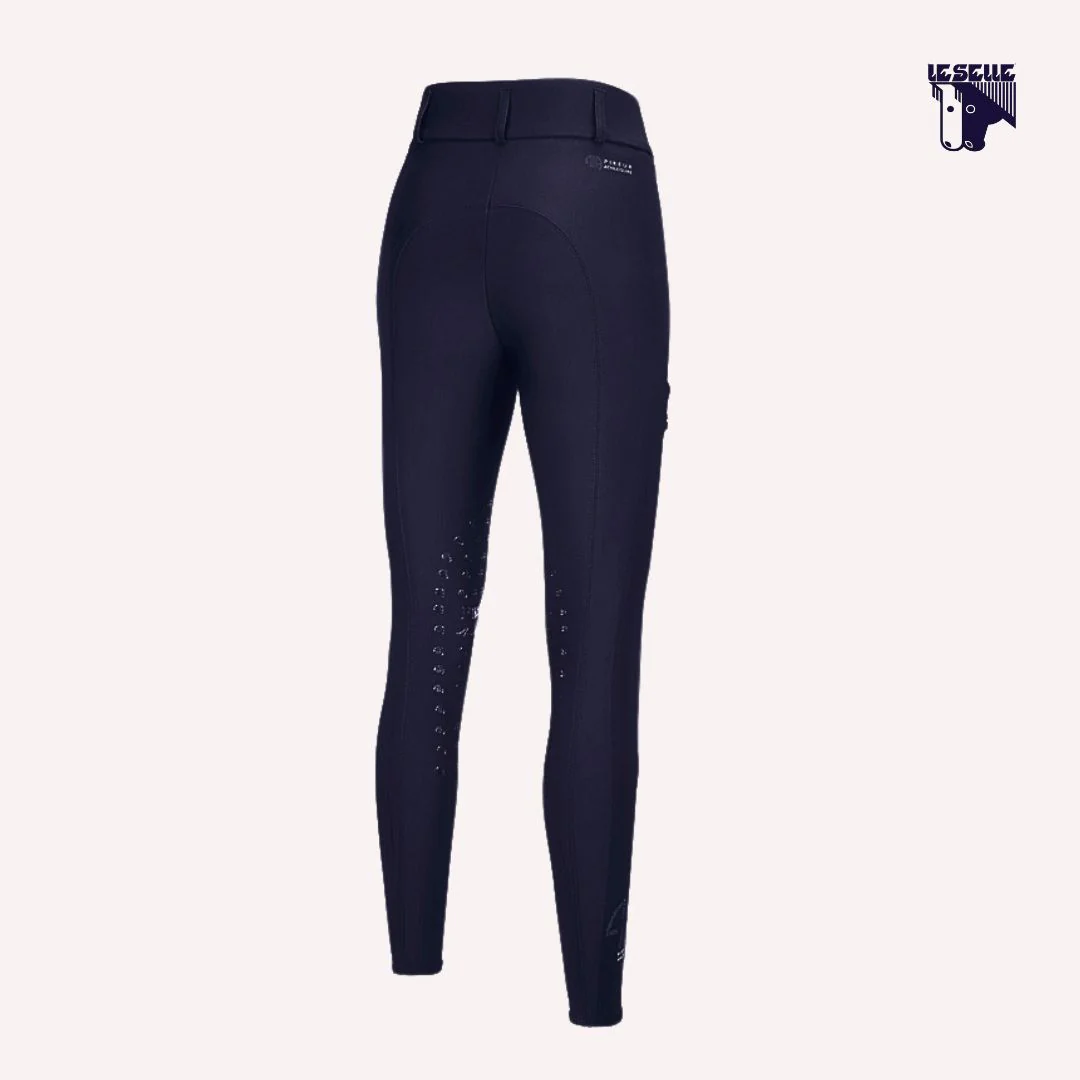 Pantaloni equitazione Pikeur Jersey elasticizzato Antibatterico e anti UV Grip stampato al ginocchio Vita media con due bottoni Due tasche anteriori Tasca per il cellulare lungo la gamba destra Loghi Pikeur tono su tono