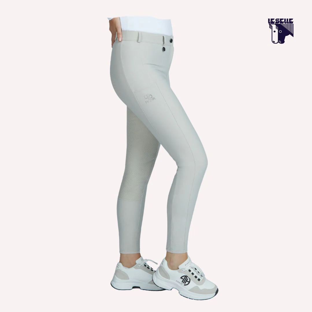 Pantaloni equitazione Pikeur Jersey elasticizzato Morbido, traspirante, anti UV Full grip integrato Vita media con un bottone Taschino con zip e cristalli a sinistra Tasca per il cellulare lungo la gamba destra Inserti con cristalli