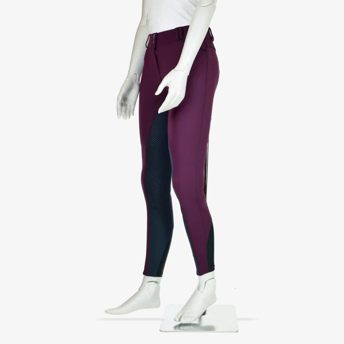 Pantaloni donna Sarm Hippique Bea Vita alta con due bottoni Due tasche Full grip resistente Bicolor prugna con grip blu Chiusura alla caviglia in lycra Tessuto tecnico elasticizzato e traspirante Facile da lavare e asciugare 100% made in Italy