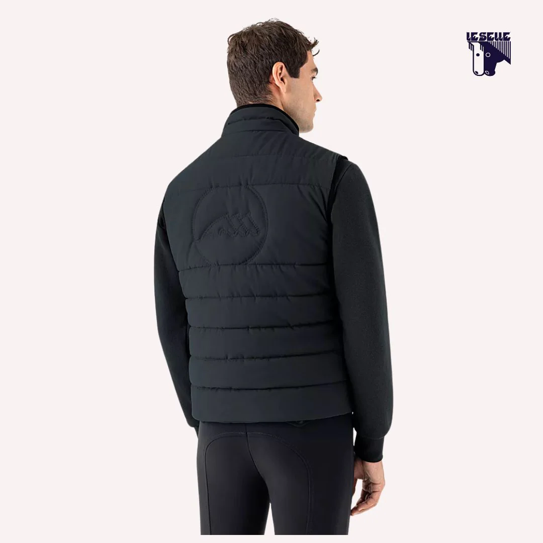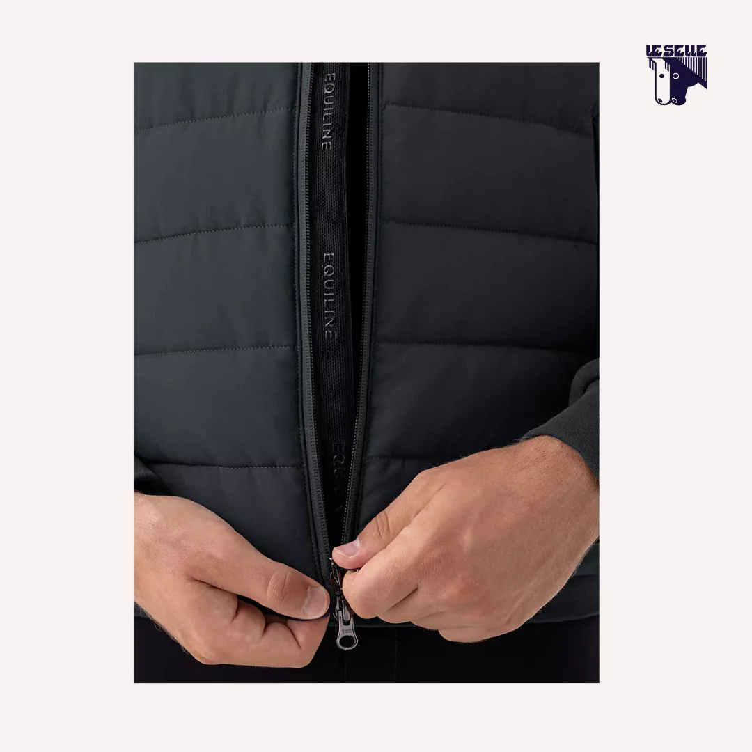 Smanicato equitazione Equiline Tessuto tecnico Morbido e confortevole Imbottitura Eco-Duvet da 100 grammi Tre tasche anteriori con zip Colletto alto Zip frontale con doppio cursore Piccolo logo frontale stampato Logo Equiline tono su tono ricamato sulla schiena Ideale anche come capo sottogiacca