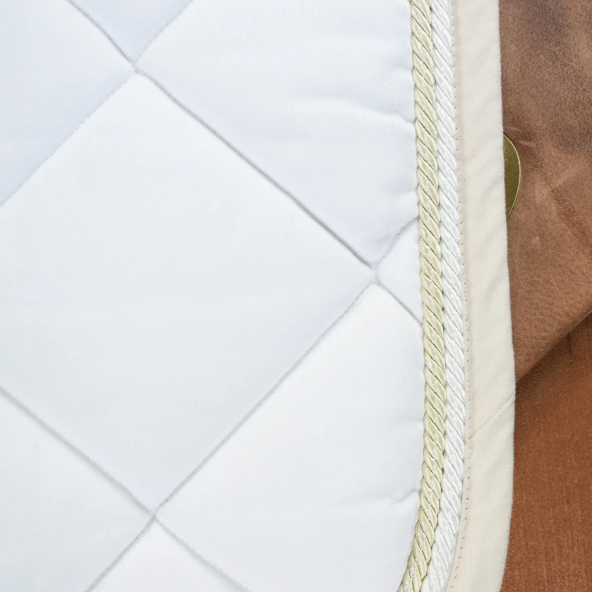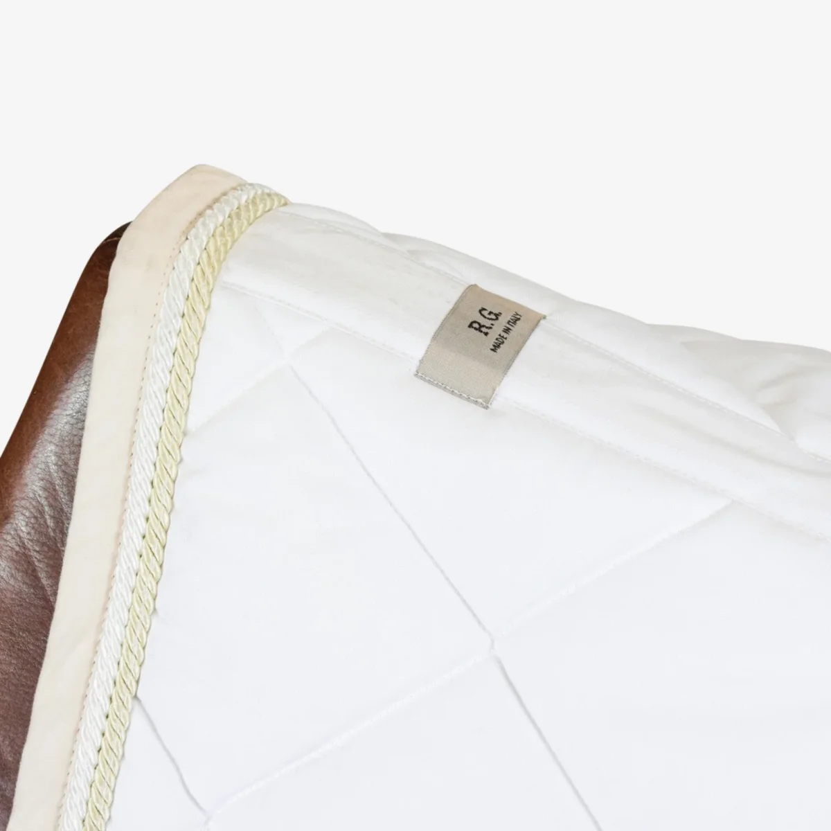 Sottosella Dressage RG Italy Esterno in cotone Interno in nido d’ape Classica trapuntatura a rombi Bordo crema con corda bianca e crema Articolo proveniente da stock, potrebbe avere qualche macchia lavabile