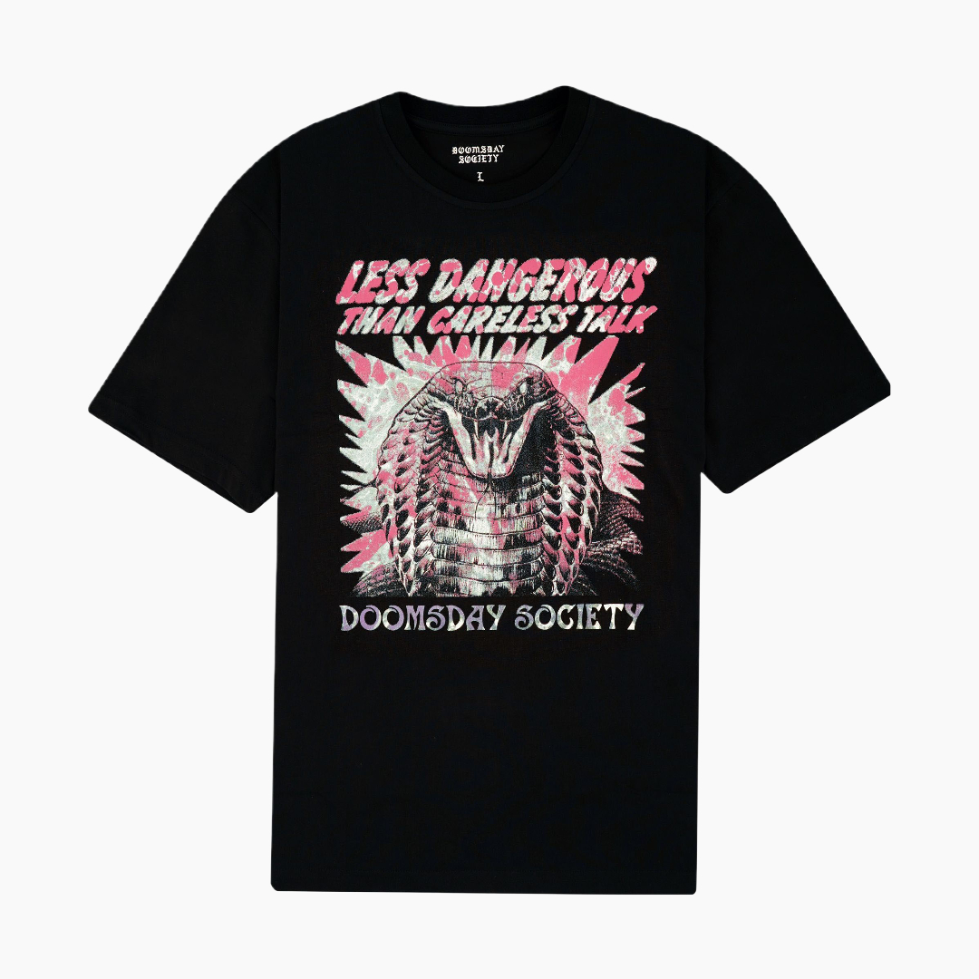La Tee DOOMSDAY SOCIETY Careless presenta una stampa frontale audace con la scritta “Less dangerous than careless talk”, che sottolinea l’importanza della libertร di espressione e del coraggio di andare controcorrente.