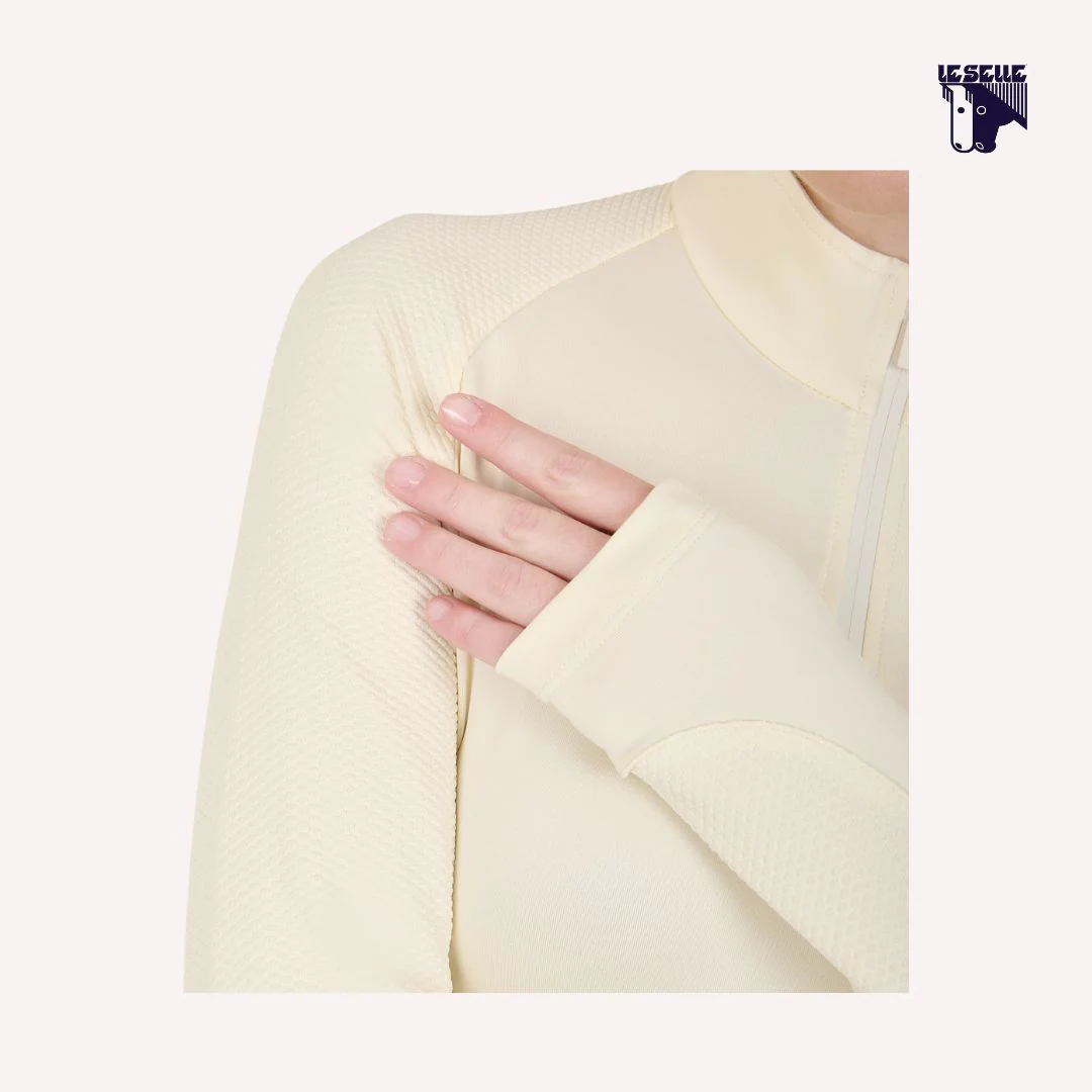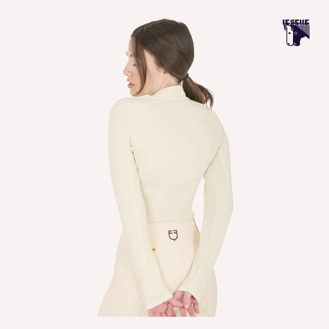Training top equitazione Tessuto tecnico elasticizzato Leggero e traspirante Collo alto Mezza zip tono su tono Manica lunga Inserti con lavorazione a nido d’ape lungo la manica Piccolo logo Equestro sul petto Facile da lavare e asciugare